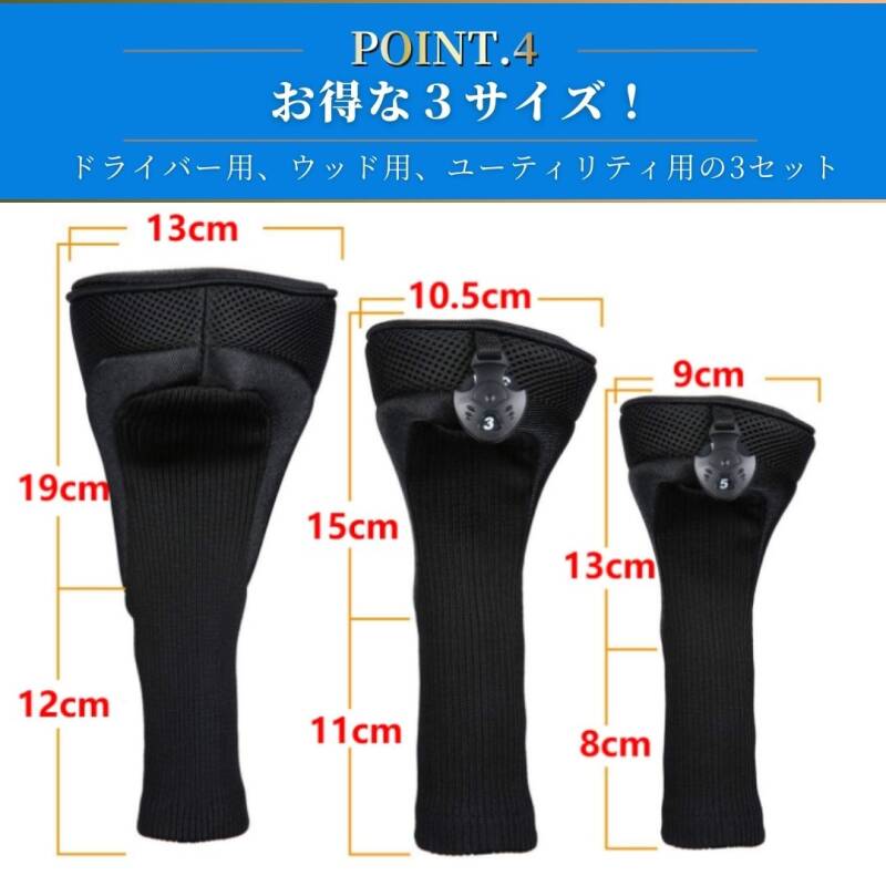 ・大(ドライバー用)×1 ・中(フェアウェイウッド用)×1 ・小(ユーティリティ用)×1 ・カラー:ブラック ・素材:ナイロン、メッシュ、ニット ・ダイヤル式番手タグ(2〜7、X)付き |