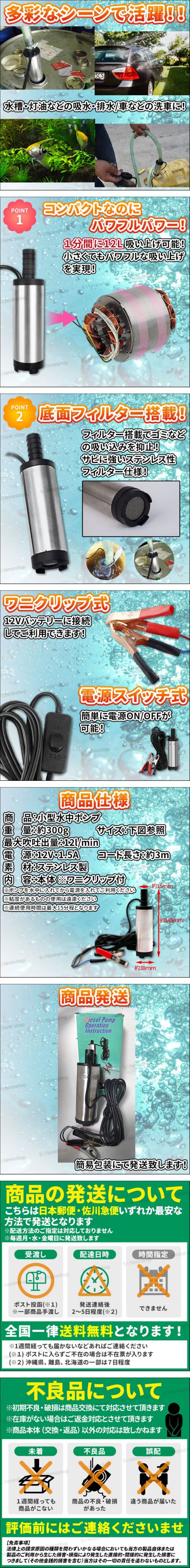 | 水中ポンプ 12V 小型 ミニ 海水 池 ポンプ 水槽 給水 排水 ワニクリップ 給油 汚水 泥水 クランプ 水中ウォーターポンプ ビルジポンプ ② | ||