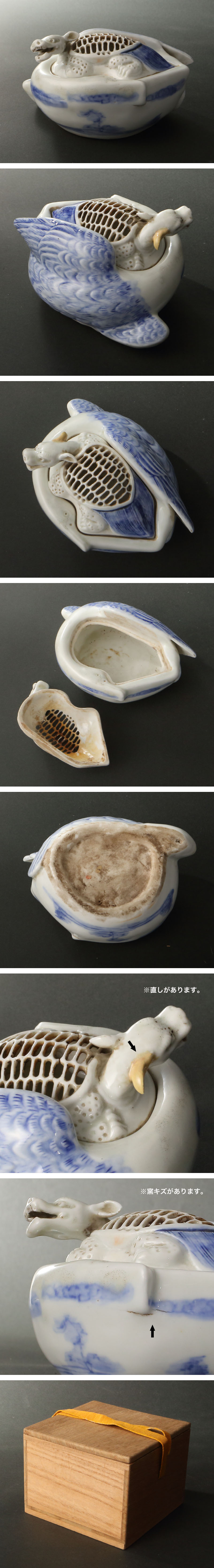 古平戸染付の香炉です。 蓋に蓑亀の細工を施したユニークな形の香炉で、亀甲に合わせ透が彫られております。前方には山水が染付されておりますが、背面には大きな羽を有し、上からよく見ると香炉全体が鶴を象っていることが判明します。 平戸焼の捻り細工物の中でも唯一無二といえる作行であり、屈指の名工と伝わる今村如猿や彼に匹敵する力量を有した無名の陶工の手に成るものと考えられます。吉祥の意匠である鶴や亀をモチーフにした平戸焼は数多くあれ、特に本作はその緻密な出来から、「亀岡」「鶴ヶ峰(館山)」を擁した平戸の偉容を、旅先で香とともに懐かしむ趣向を有していたのではないかと推察されます。 愛すべき逸品です。 付属:時代箱が付属します。 寸法:高さ8.5cm、幅14.5cm、奥行10cm(最大幅。若干の誤差はご了承下さい) 状態:経年感、使用感、複数カマキズ、直しがございます。 |