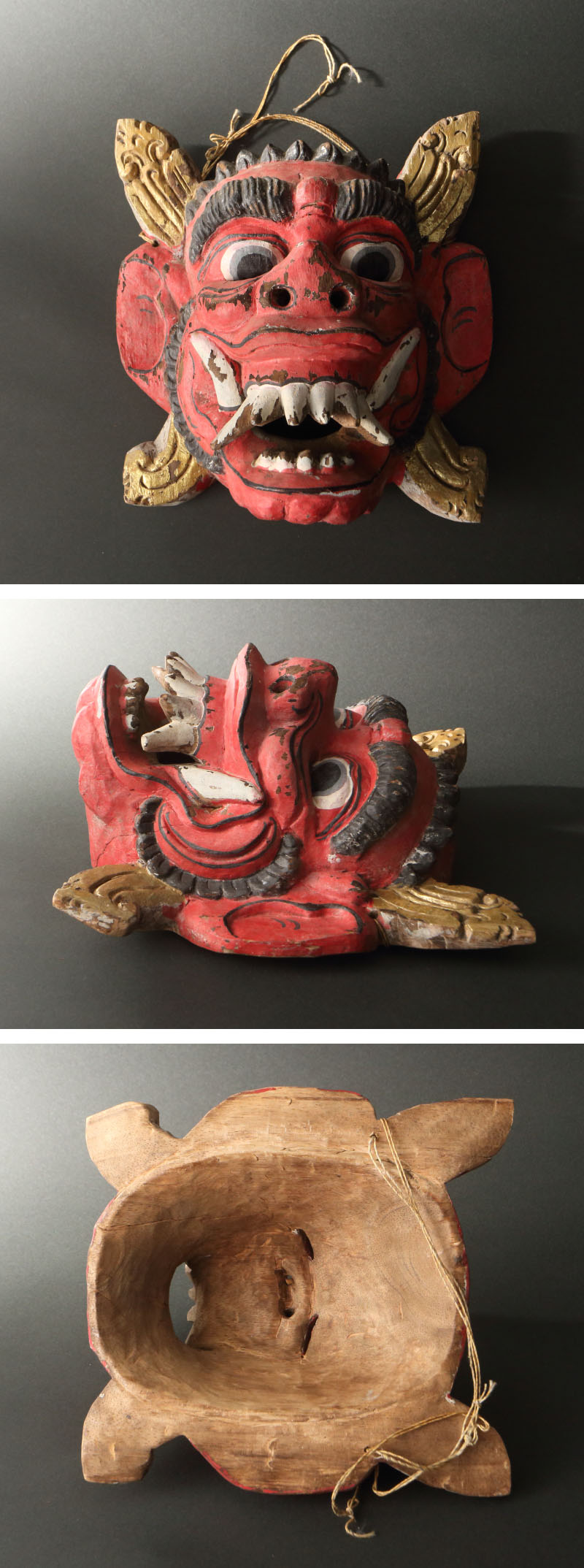 20世紀初頭インドネシアの舞踊面です。 ヒンドゥー神話でラークシャサ族(羅刹)の王とされ、セイロン島(現・スリランカ)を本拠としたラーヴァナを象った面です。10ある頭を1つずつ切り落とし火にくべる1000年間の苦行により「神に負けない」特権を得、大叙事詩『ラーマーヤナ』ではヴィシュヌ神の化身であるラーマの妃・シーター姫を略奪し、大戦争の原因となったことで知られます。 本作はインドネシアの宮廷舞踊を淵源とするワヤン・ウォンで用いられた面(トペン)と見られますが、よく似た面がスリランカに存在するほか、バリ島のトランス儀礼であるバロン・ダンスで魔女ランダと戦う聖獣バロンの面にも共通した意匠がみられ、古典文化であったヒンドゥー舞踊が広く親しまれ、シヴァ神やラークシャサ族に肩入れする土着の信仰と混淆したことが推察されます。 獅子舞など、日本の舞踊面にも通底する精神性が感じられる逸品です。 ◆ラーヴァナ インドの叙事詩ラーマーヤナに登場する羅刹(ラークシャサ)の王。ブラフマー(梵天)の曾孫あるいは孫にあたり,富の神クベーラ(毘沙門天)の異母弟である。彼は苦行の結果,梵天の恩寵を受け神々や鬼神に殺されない身体となり、兄クベーラから南海の都市ランカーを譲られたが、自己の力に慢心し乱暴狼藉の限りを尽くして数々の呪詛を受け,さらにラーマ王子の妻シーターを誘拐してランカーに幽閉したため,ラーマの攻撃をうけ殺される。 寸法:高さ26.5cm、幅24cm、奥行13cm(最大幅。若干の誤差はご了承下さい) 状態:経年感、ワレ・カケ多数、塗のハゲがございます。 |