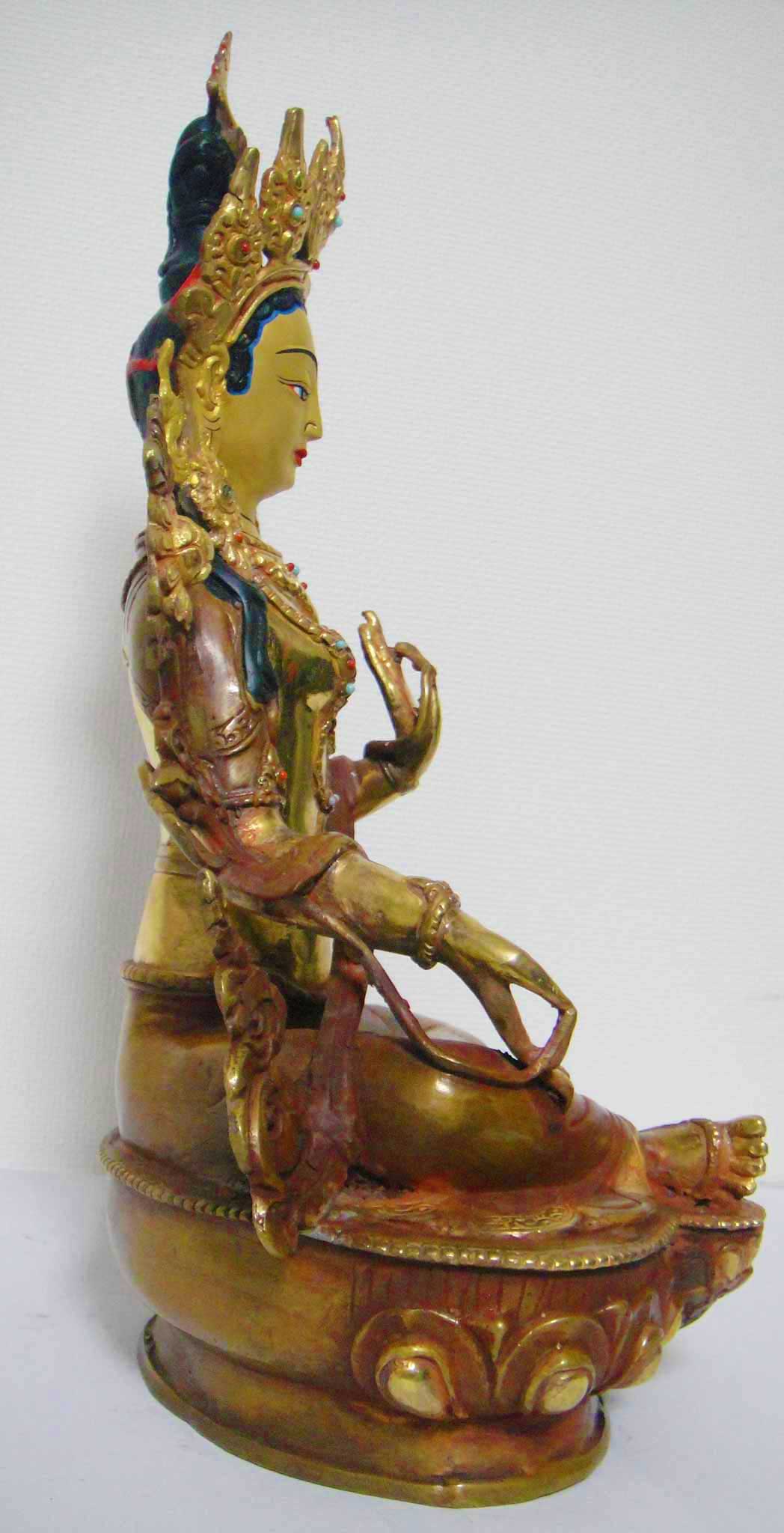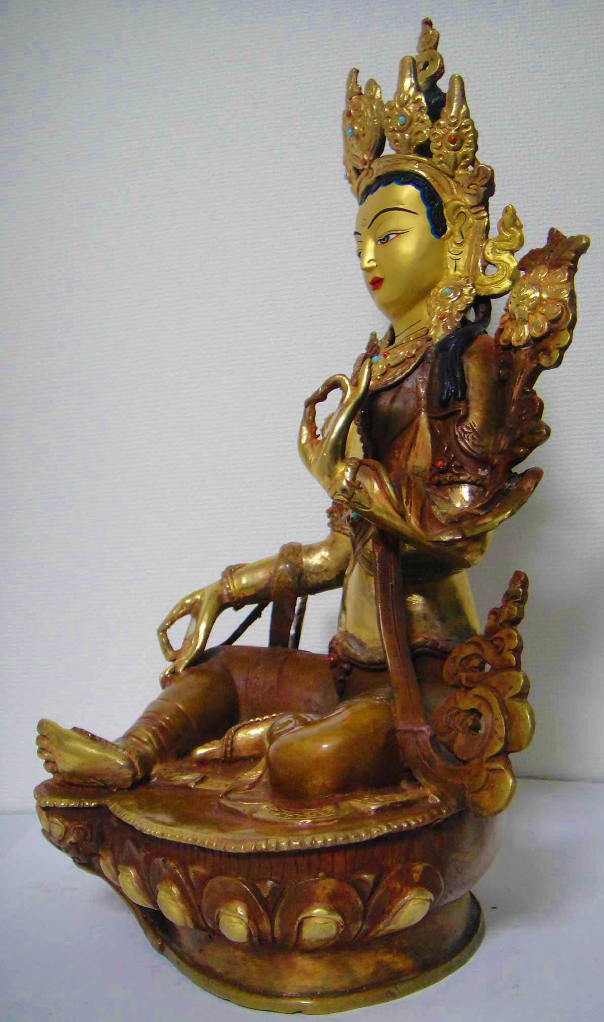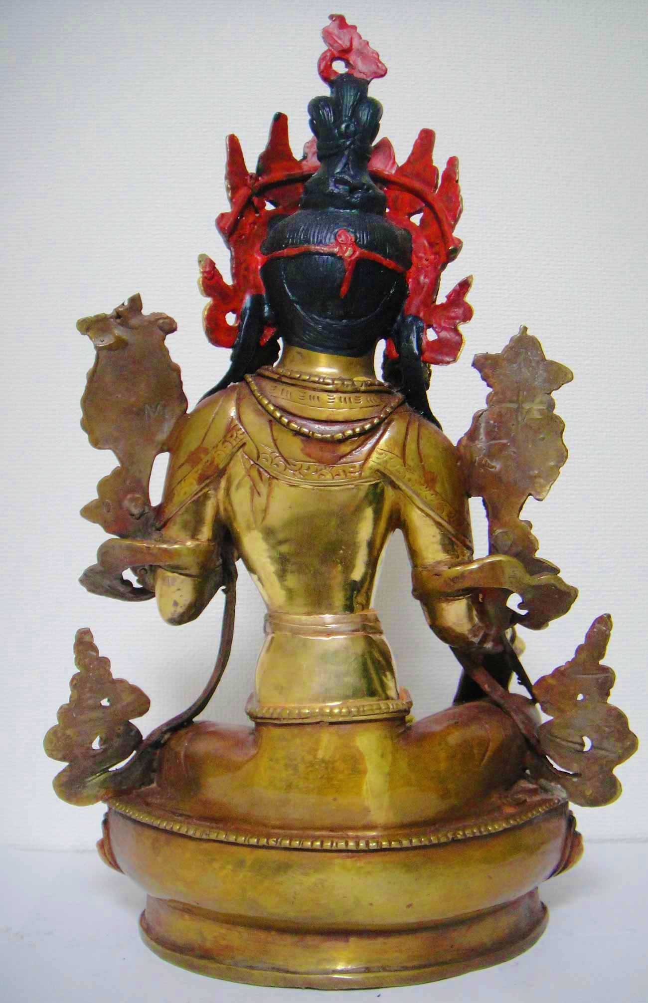 即決◆グリーンタ-ラ(緑多羅菩薩)像◆仏教 チベット ネパール 緑多羅菩薩は観音の左瞳の涙から生まれた美しい女神で、 観音の救済にもれた人々も残さず救う万能の救済神で、 財運・金運や災難除けなど現世利益に効験ありとされ幅広く信仰されております。 商品説明 ★サイズ:高さ約33cm、最大幅22cm、奥行き:約11cm、重さ:2900g ★銅製、部分的に鍍金(24金) ★ネパール製・新品未使用 ★重量感たっぷりの細かな彫り細工が見事な仏像です。 |