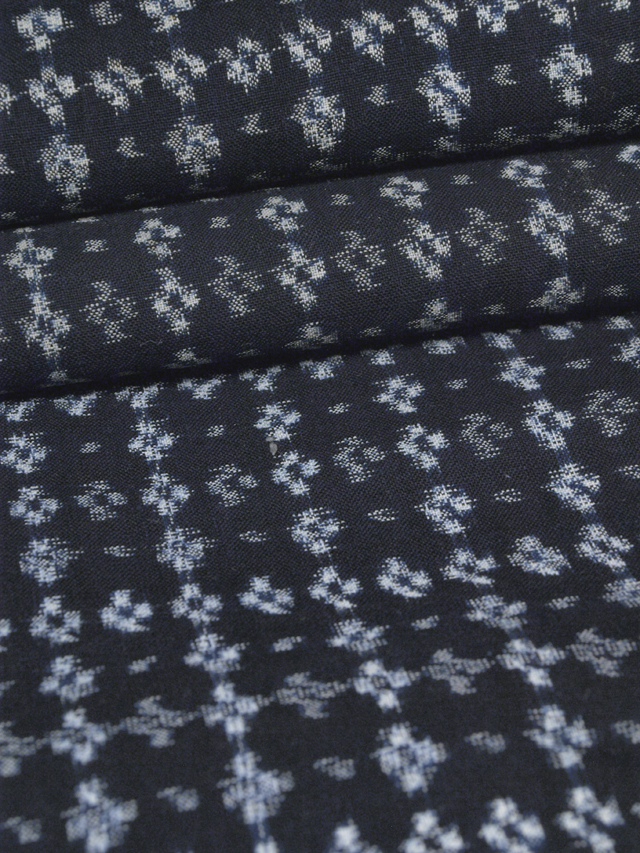 濃藍(こいあい)色の地に、絣で四つ玉の文様が織り込まれた、綿絣のはぎれです。 昭和初期ごろにつくられたと思われるアンティークのお品です。うすよごれやくすみ、ムラ、小穴や穴の補修跡、こまかな黄変などが若干ありますが、気になるようなものはありません。目につく大きなしみやよごれ、褪色などのダメージは見あたらず、この時代のものとしては、たいへんきれいな状態です。洗い張り済みなので、気持ち良くお使いいただけます。※風楽の出品内で同じ柄のものを複数出品している場合もあります。 |