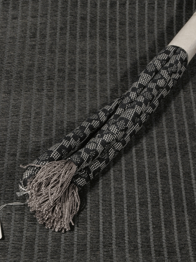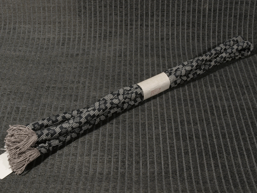 黒色の地に白練(しろねり)色の絣で市松格子縞と幾何学的にあらわされた花の文様が織り込まれている丸ぐけの帯締めです。 未使用保管品で、しみやよごれ、褪色などのダメージもありません。新品同様です。 |