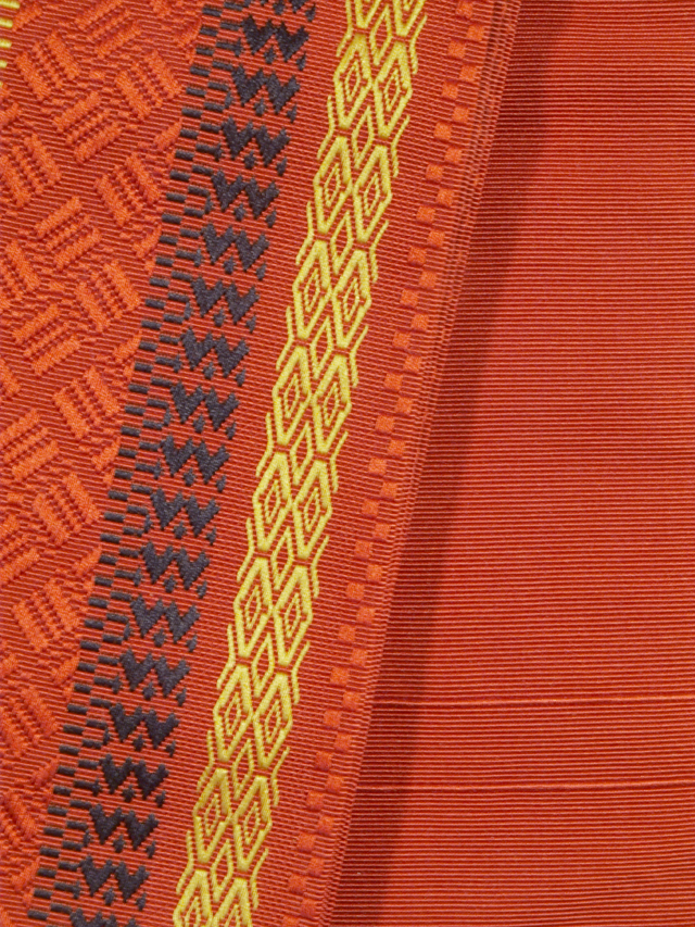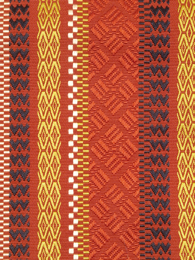 さまざまな幾何学的な小紋の縞が民族調の雰囲気も醸していて、モダンな小粋さが感じられます。博多織らしいややハリのある地風です。