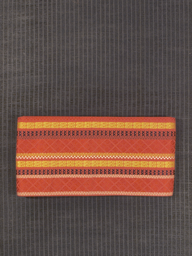 詳細  やや沈んだ赤茶色の地に、幾何学的な小紋の配された縞の文様が織り込まれている、本場筑前博多織の半巾帯です。小袋帯です。