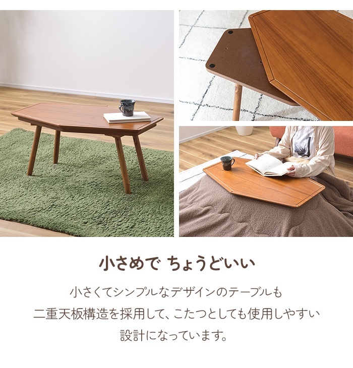 | 小さめでちょうどいいコンパクトサイズのこたつテーブル。 二重天板構造を採用して、こたつとしても使いやすい設計になっています。 天板と同じスペースに布団がきれいに掛かるので、よりスッキリとした印象で使用できます。 天然木アカシアの独特な風合いを生かし、ラインとを施したシンプルなデザイン。 天板のエッジはシャープにカットされ、テーブル全体をスッキリ見せてくれます。 脚は回して取り付けるだけなので、工具不要で簡単に組み立てることができます。 |