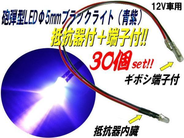 ■メール便送料無料!抵抗器内臓+端子付LED砲弾型Ф5mmブラックライト青紫 30個セット/12V車用■ | |||
