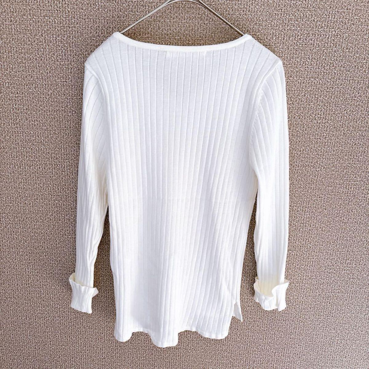 リブ編みのホワイトVネック長袖トップス、Mサイズ、裾がラウンドカットでスタイリッシュ。