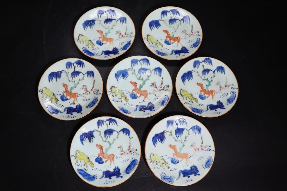 | 大清嘉慶年製 底款 色絵 樹下群馬図 皿 七客 木箱付 / 清 嘉慶 中国美術 茶器 煎茶道具 銘々皿 小皿 .G1718 |