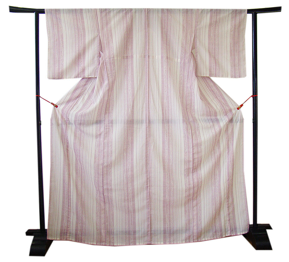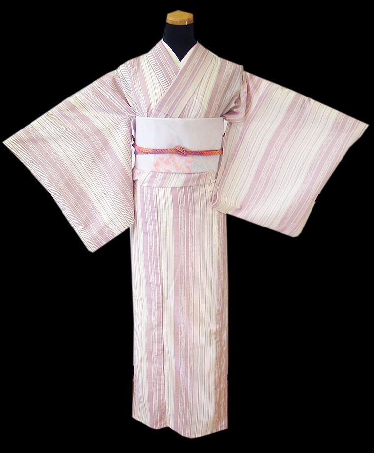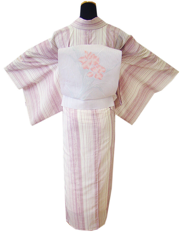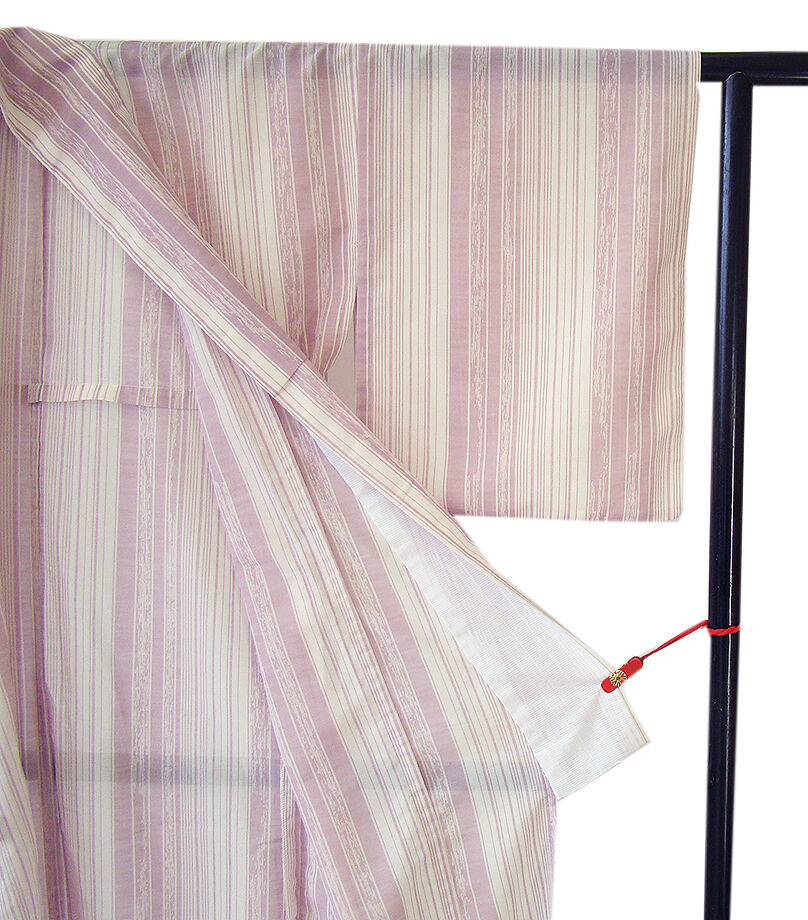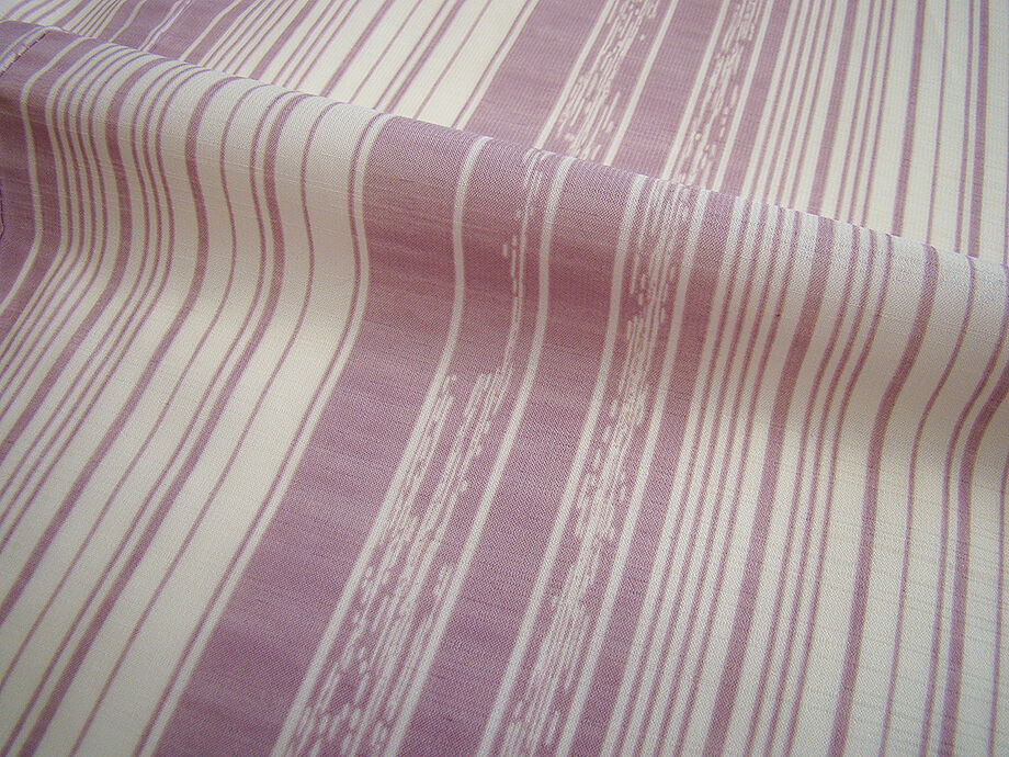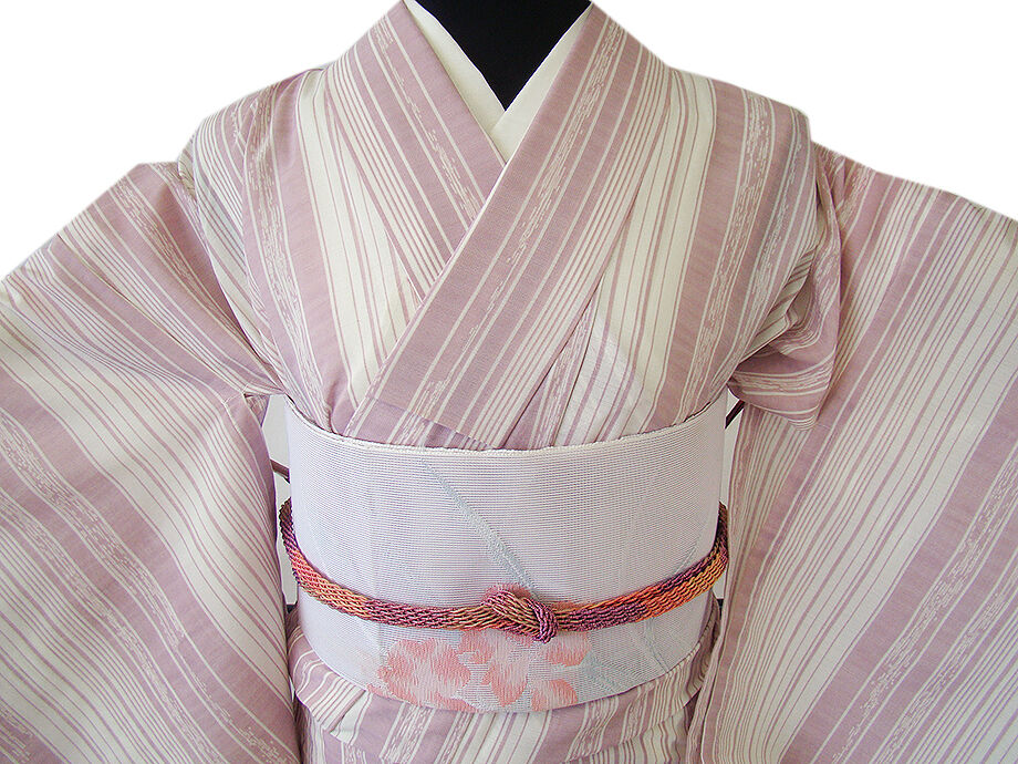白色と浅紫色の太細縞柄の染柄が洒落感溢れる着物姿を演出しております。