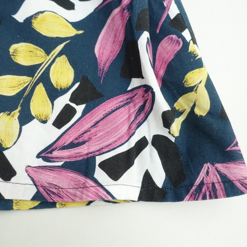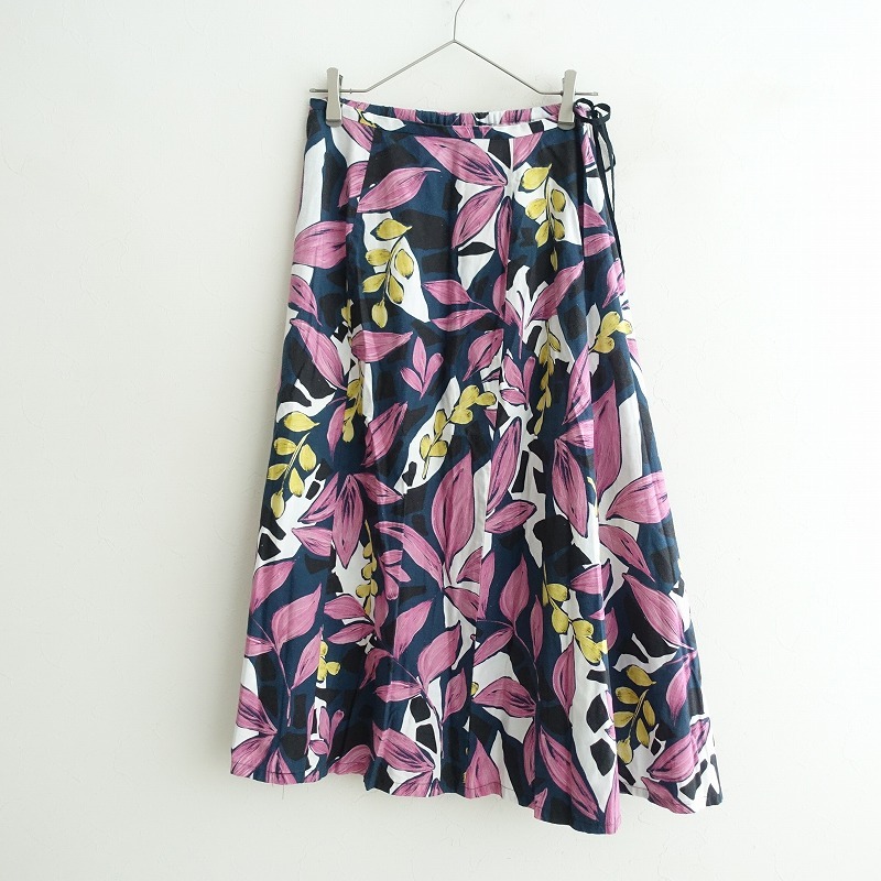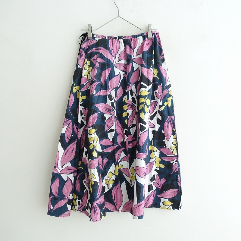 | HOUSE OF LOTUSのマルチリーフフレアスカートです。カラーはネイビー、ピンク、ホワイト、イエローなどで、リーフプリントの施されたコットンリネン地で仕立てられています。左サイドにファスナーで、ウエスト後ろはゴム仕様で、ひもが通っており調整可能です。定価(メーカー希望小売価格) 41,800円の商品です。 |
