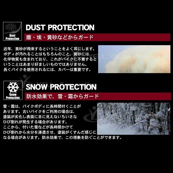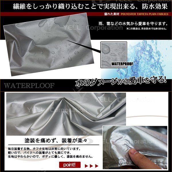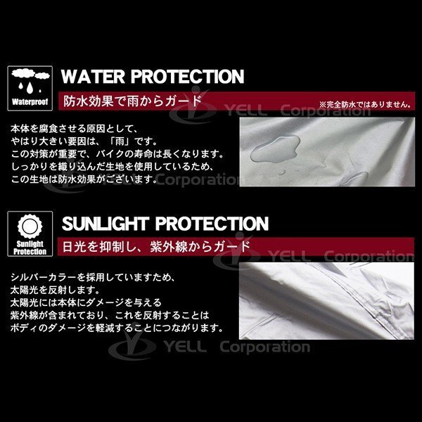 | 注意 | 古い年式の車種ほど経時劣化により、 ボディー塗装面に微小なひび割れ等ができ、 シミの様な模様が発生しやすい状態になってます。 車体及びカバーが濡れた状態でご使用になられた場合、 シミ模様が発生する可能性が非常に高くなります。 カバー使用中に万一塗装面に変化が見られた場合は、 直ちにカバーのご使用をおやめください。 |