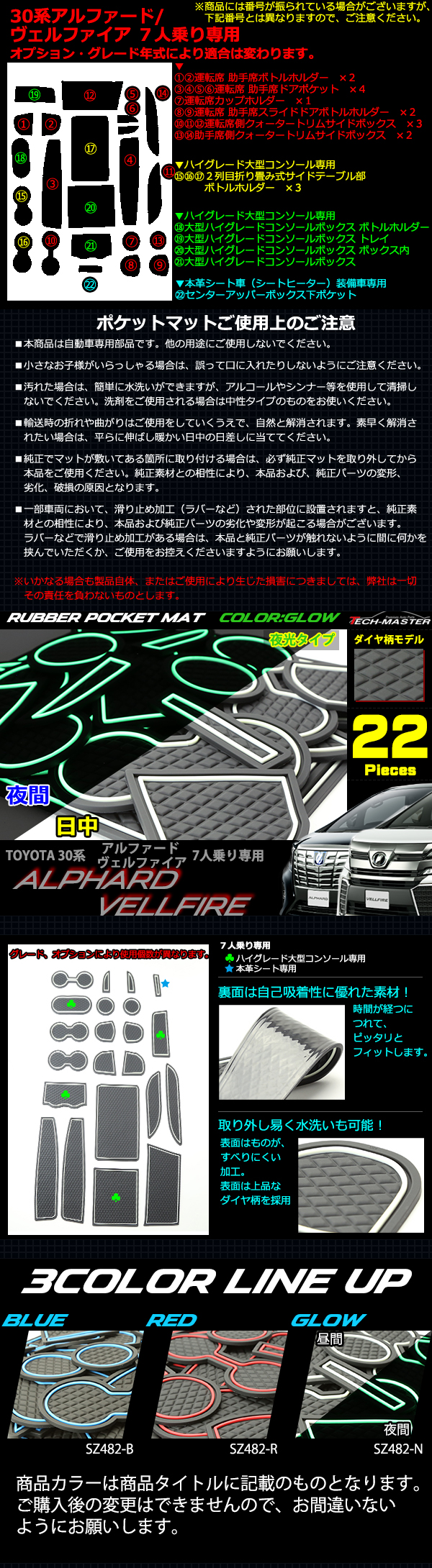 ■商品コード SZ482-N ■タイトル 30系 アルファード / ヴェルファイア 7人乗 ゴム ラバー ポケット マット ■適合車種 トヨタ 30系 アルファード / ヴェルファイア 7人乗り専用 ※8人乗りには一部使用できません。 ※グレード・オプションにより使用個数が異なります。 ※詳細適合箇所は、画像に掲載 ※特別仕様車は、通常車から内装変更されておりますので画像に特別に記載がない限りは適合外。 ■数量 1セット22点セット ■商品カラー ダイヤ柄、グロー(夜光。昼間は少しイエローのホワイト、夜間はグリーン系の蛍光色) ■特徴 ドアポケットやドリンクホルダー、小物入れに敷くだけで傷や汚れを防止し、滑りどめにもなるゴム素材のマットです。 運転中に少し気になるポケット内の物音も軽減し、水で洗えてお手入れも簡単! マット洗浄時はチェーンを取り外してください。 自己吸着性に優れ、時間が経つにつれてピッタリフィットします。 ■関連商品 アルファード ゴムポケットマット アルファード対応商品 ヴェルファイア ゴムポケットマット ヴェルファイア対応商品 |