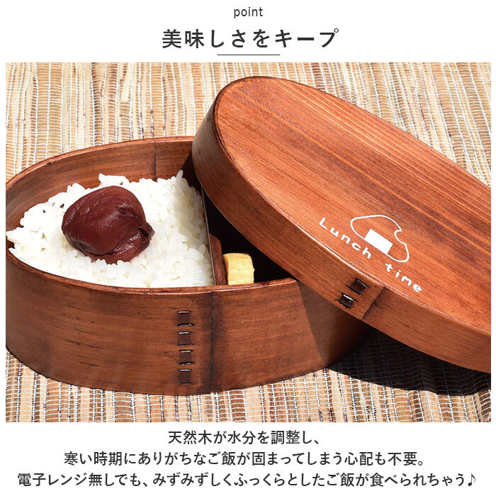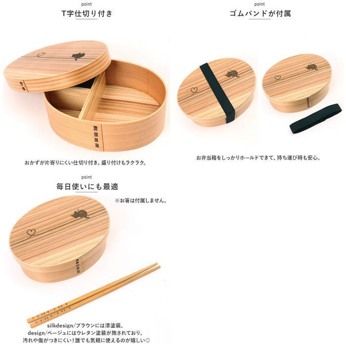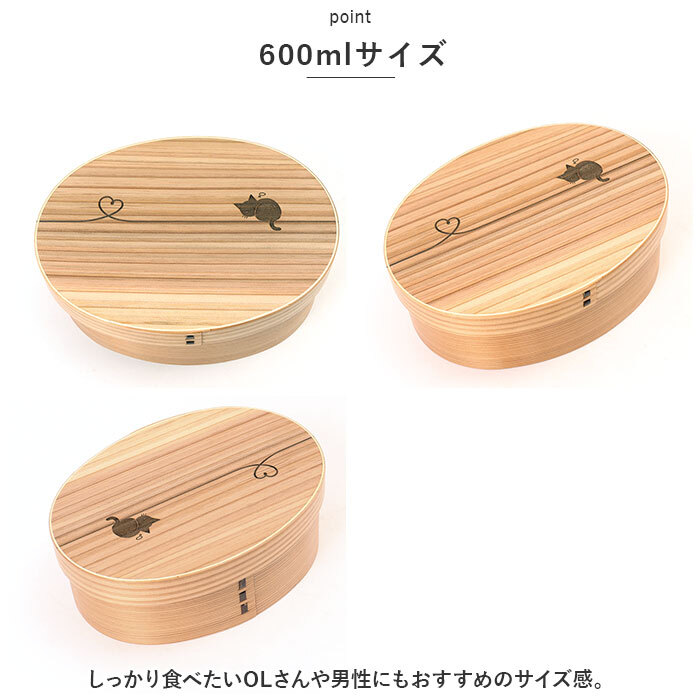 | 商品説明 | ・・いつものランチをもっと美味しく♪可愛らしいデザイン入りの曲げわっぱ弁当箱(Mサイズ)が登場。 ・【日本の伝統的な曲げわっぱ弁当箱】 ・天然木の素地を使用しており、木の調湿作用でご飯がベチャつかない!通気性が良く、梅雨の時期や夏場でもお弁当が傷みにくいのがポイント。 ・【美味しさをキープ】 ・天然木が水分を調整し、寒い時期にありがちなご飯が固まってしまう心配も不要。電子レンジ無しでも、みずみずしくふっくらとしたご飯が食べられちゃう♪ ・【毎日使いにも最適】 ・silkdesign/ブラウンには漆塗装、design/ベージュにはウレタン塗装が施されており、汚れや傷がつきにくい!誰でも気軽に使えるのが嬉しい◎ ・【T字仕切り付き】 ・おかずが片寄りにくい仕切り付き。盛り付けもラクラク。 ・【ぬくもりのある弁当箱】 ・美しい木目と優しい風合いが魅力◎高級感のある仕上がりで、おかずの見栄えもアップ。 ・【ゴムバンドが付属】 ・お弁当箱をしっかりホールドできて、持ち運び時も安心。 ・【600mlサイズ】 ・しっかり食べたいOLさんや男性にもおすすめのサイズ感。 ・【オリジナリティ溢れるデザイン】 ・ほっこりするメッセージや可愛いイラストのデザイン入り。silkdesign/ブラウンはシルク印刷、design/ベージュはレーザー刻印タイプ。 ・【新生活のお供に】 ・これから始まる新生活、新学期に合わせてお弁当箱を新調♪毎日のランチが楽しみになること間違いなし! |