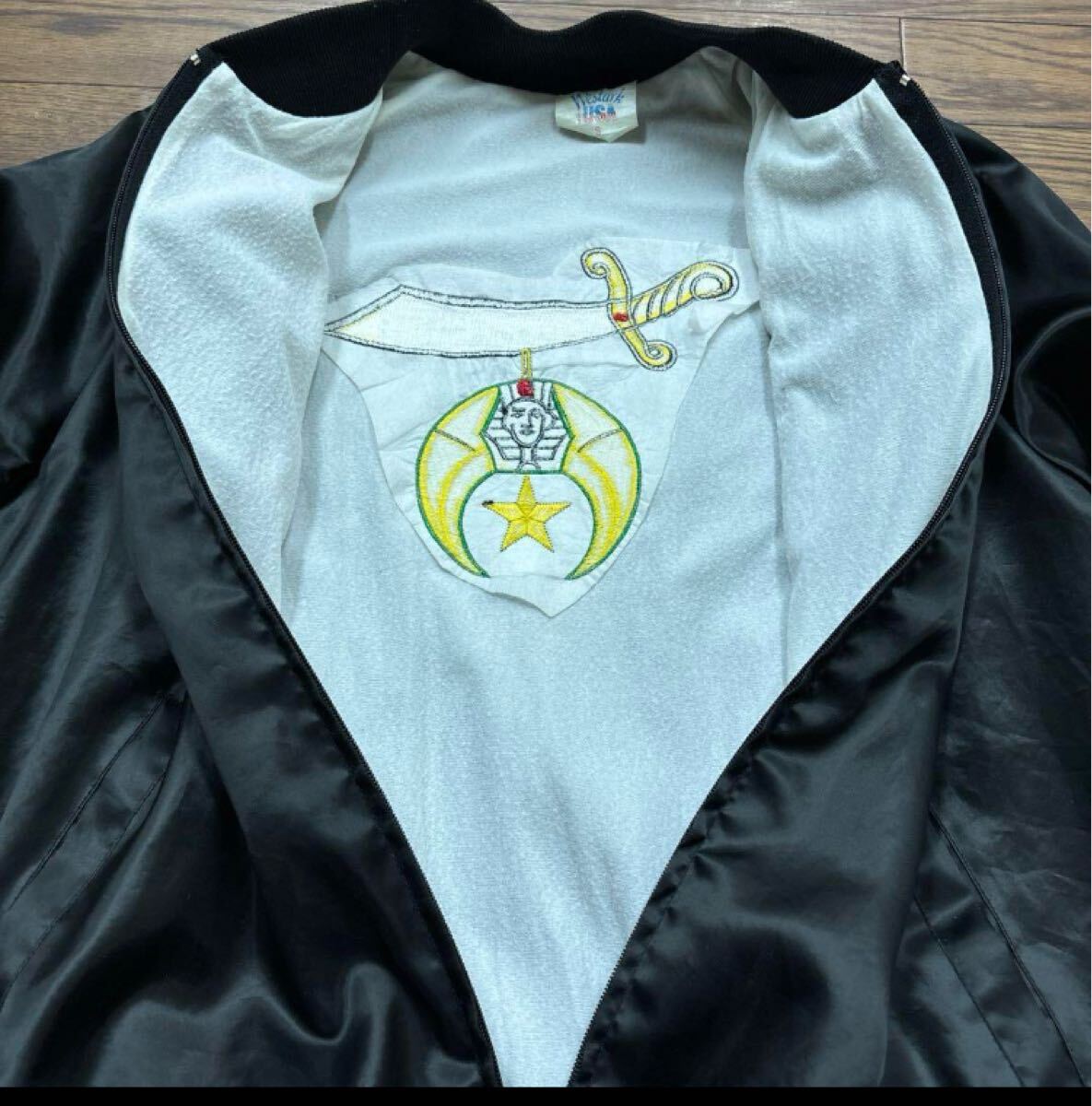 刀とスフィンクスの刺繍が施されたブラックボンバージャケット。