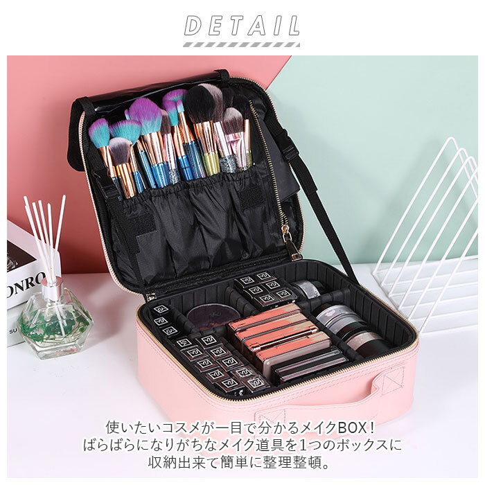 | 商品説明 | ・・使いたいコスメが一目で分かるメイクBOX! ・ばらばらになりがちなメイク道具を1つのボックスに収納出来て簡単に整理整頓。気分もスッキリ! ・メインの収納部分は、仕切り板が取り外し出来るので、収納したい大きさに合わせて調節が出来て便利。 ・フタのフラップを開くとブラシの収納に便利なポケットを4つ配置。内側はビニール素材でコーティングされており、ブラシに残っているメイクが付いてもサッと拭き取り可能◎ ・フラップの右側にジッパー付きポケットがあるのもうれしい。 ・さらに両脇のバックルベルトタイプのストッパーを搭載。 ・持ち手があるので、持ち運びも便利。メイク道具だけでなく、小物入れとしても使える優れものアイテム♪ ・コスメオタクさんや美容系インフルエンサーさんにもおススメ☆ |
