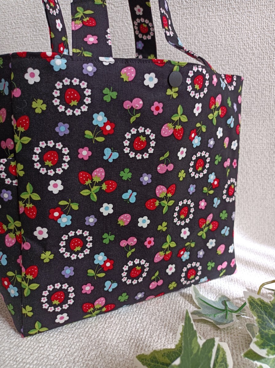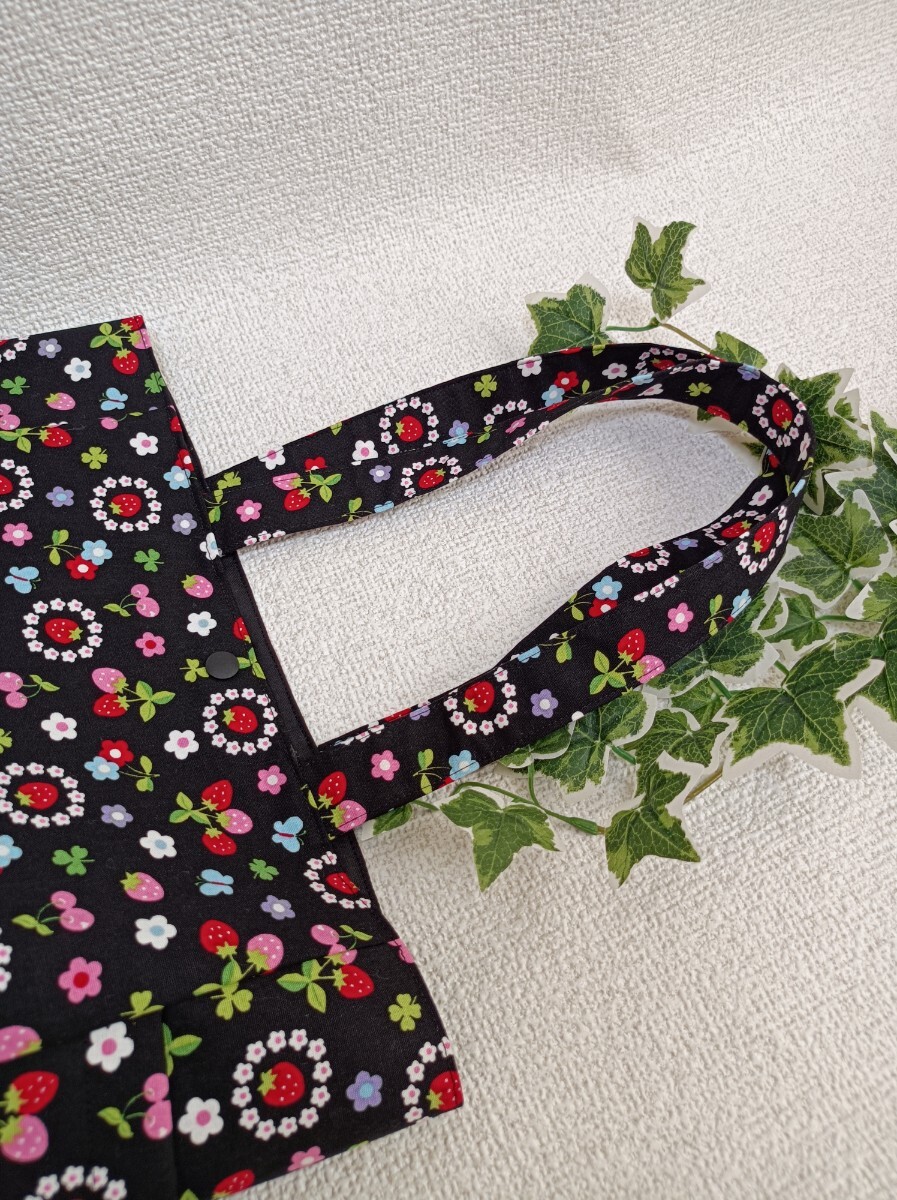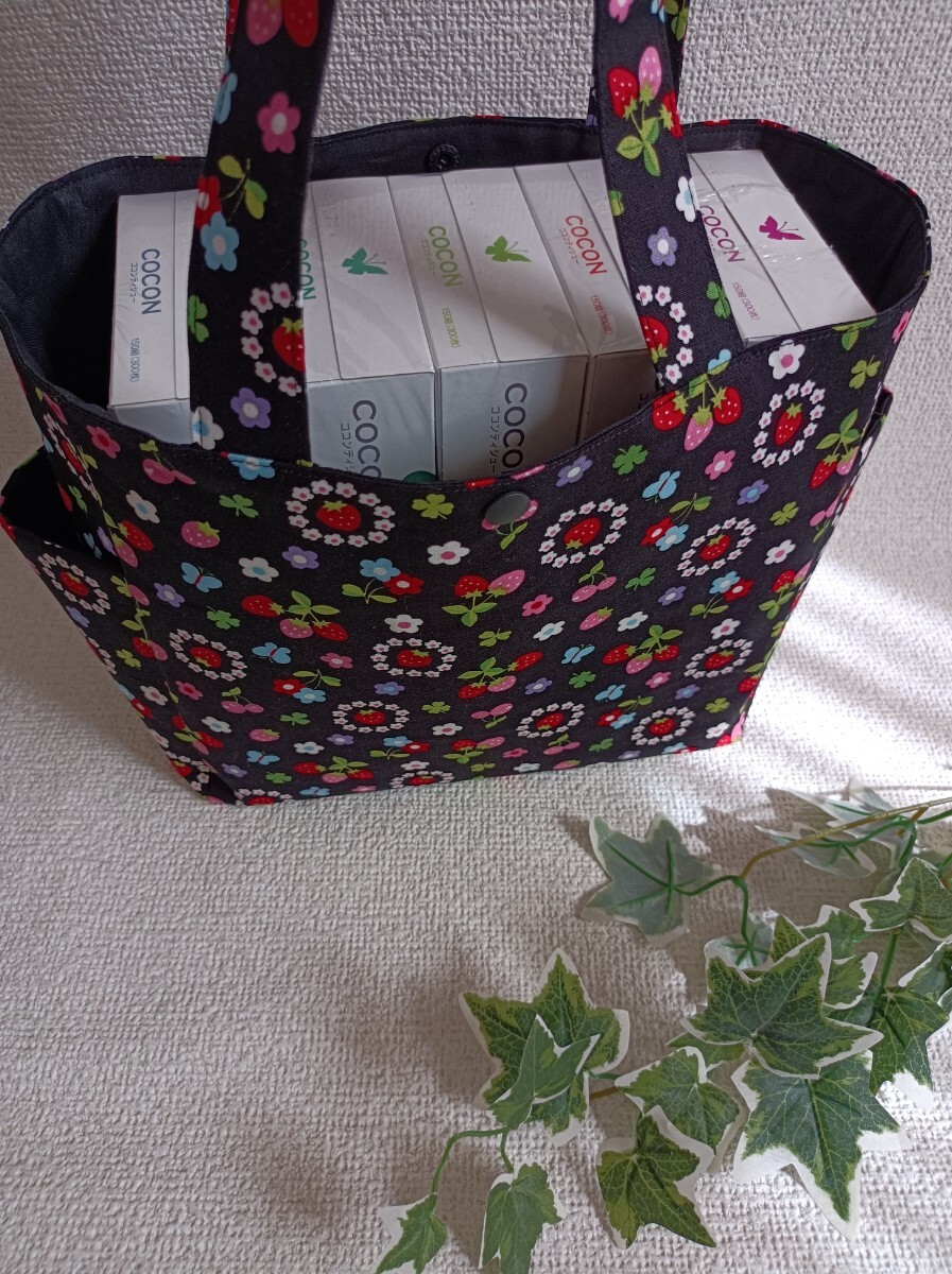 | たくさんの中からご覧頂きありがとうございます。 こちらはサイドポケット付きトートバッグです。 表地は黒地に苺と花柄 裏地は黒色 サイズ…約 縦24cm×横37.5cmマチ12cm持ち手の長さ54cm 内ポケット1つ縦17cm×横20cm 綿生地です どのお洋服にも合うお色です。 プラボタン留め 接着芯を貼ってあるので多少張りがあります。 生地に織傷やネップがある場合があります。 箱ティッシュ5箱分くらいが入る大きさです。 500mlのペットボトルも並べて写真に撮っています。 参考になさってください 折りたたんでの発送になります。 丁寧な作業を心掛けていますが至らない箇所も御座います。 神経質な方や完璧な物をお求めの方はご入札をご遠慮下さい。 他にもたくさん出品しております。合わせてご覧くださいませ♪ | ||