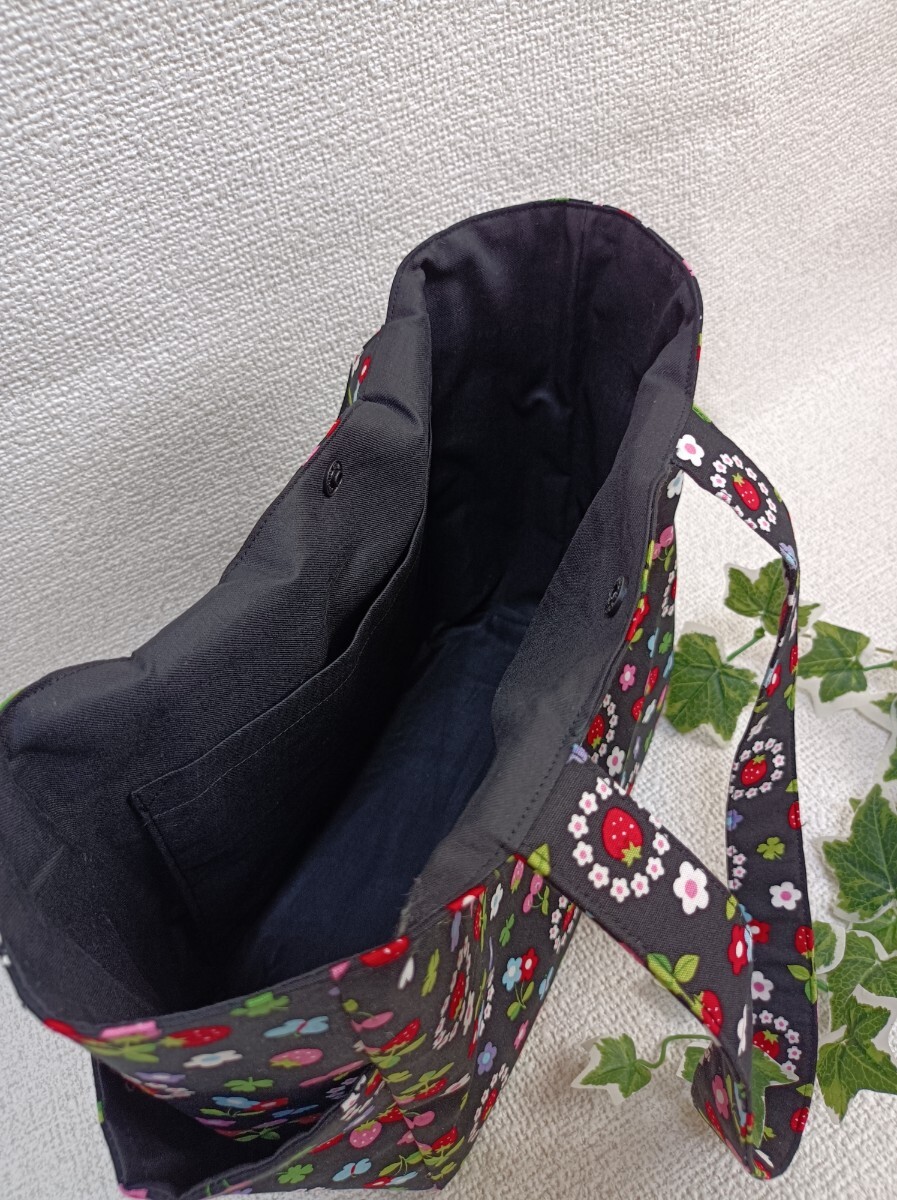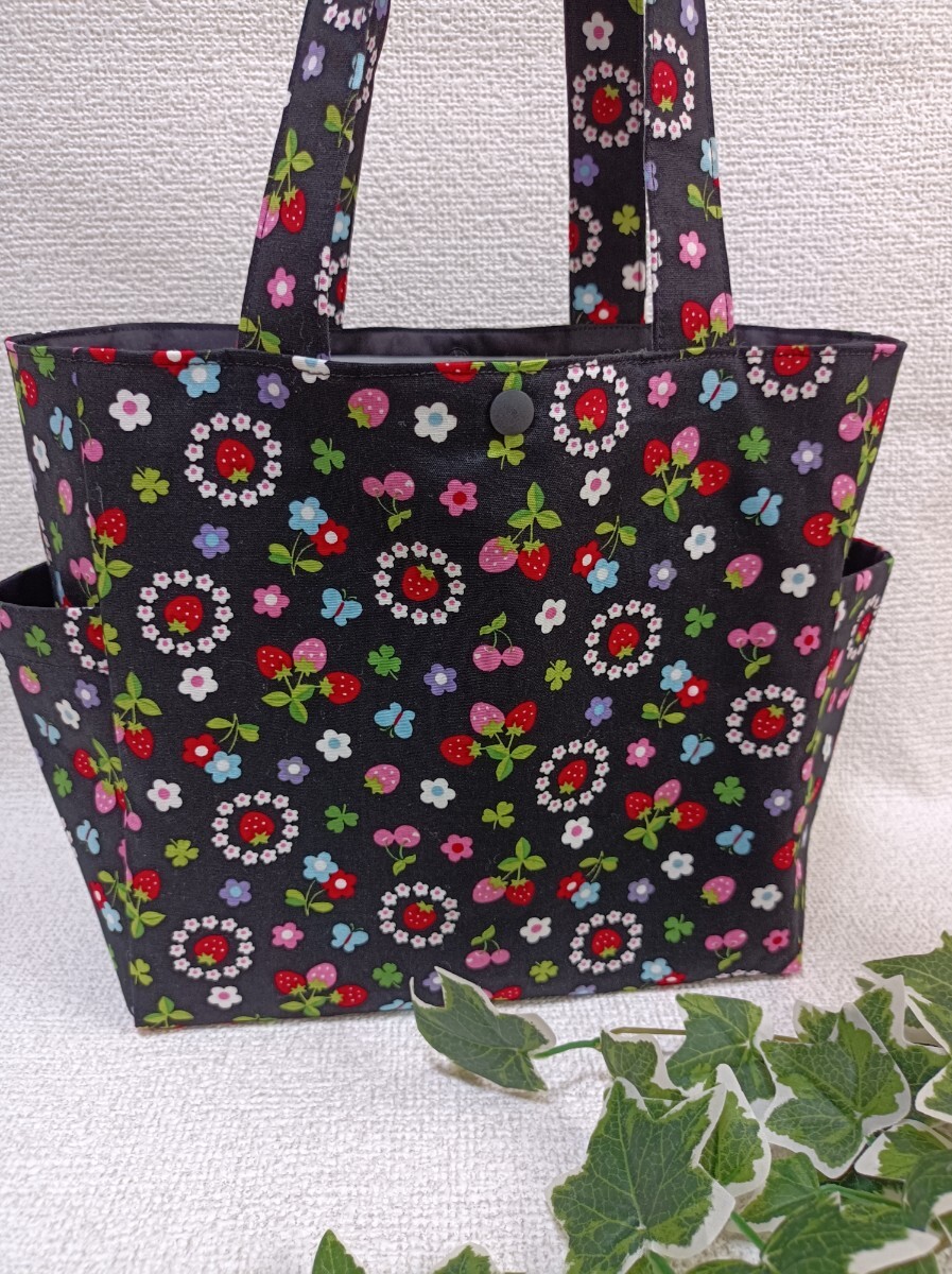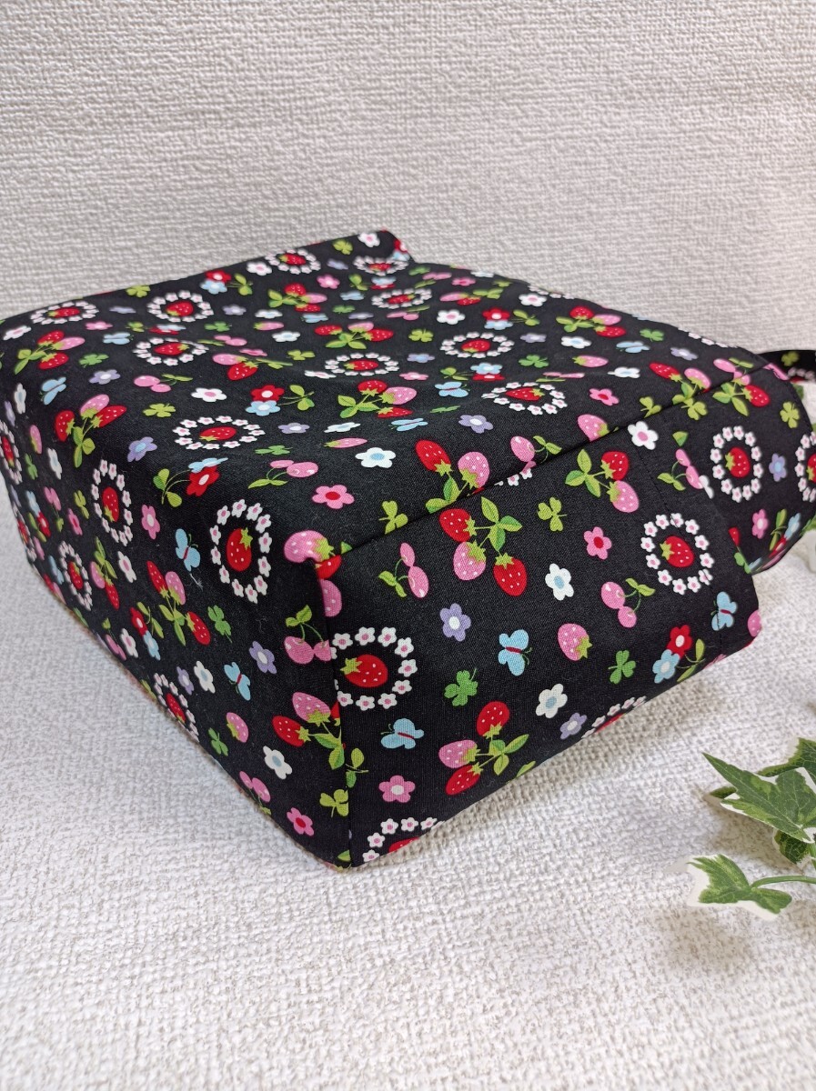 | たくさんの中からご覧頂きありがとうございます。 こちらはサイドポケット付きトートバッグです。 表地は黒地に苺と花柄 裏地は黒色 サイズ…約 縦24cm×横37.5cmマチ12cm持ち手の長さ54cm 内ポケット1つ縦17cm×横20cm 綿生地です どのお洋服にも合うお色です。 プラボタン留め 接着芯を貼ってあるので多少張りがあります。 生地に織傷やネップがある場合があります。 箱ティッシュ5箱分くらいが入る大きさです。 500mlのペットボトルも並べて写真に撮っています。 参考になさってください 折りたたんでの発送になります。 丁寧な作業を心掛けていますが至らない箇所も御座います。 神経質な方や完璧な物をお求めの方はご入札をご遠慮下さい。 他にもたくさん出品しております。合わせてご覧くださいませ♪ | ||