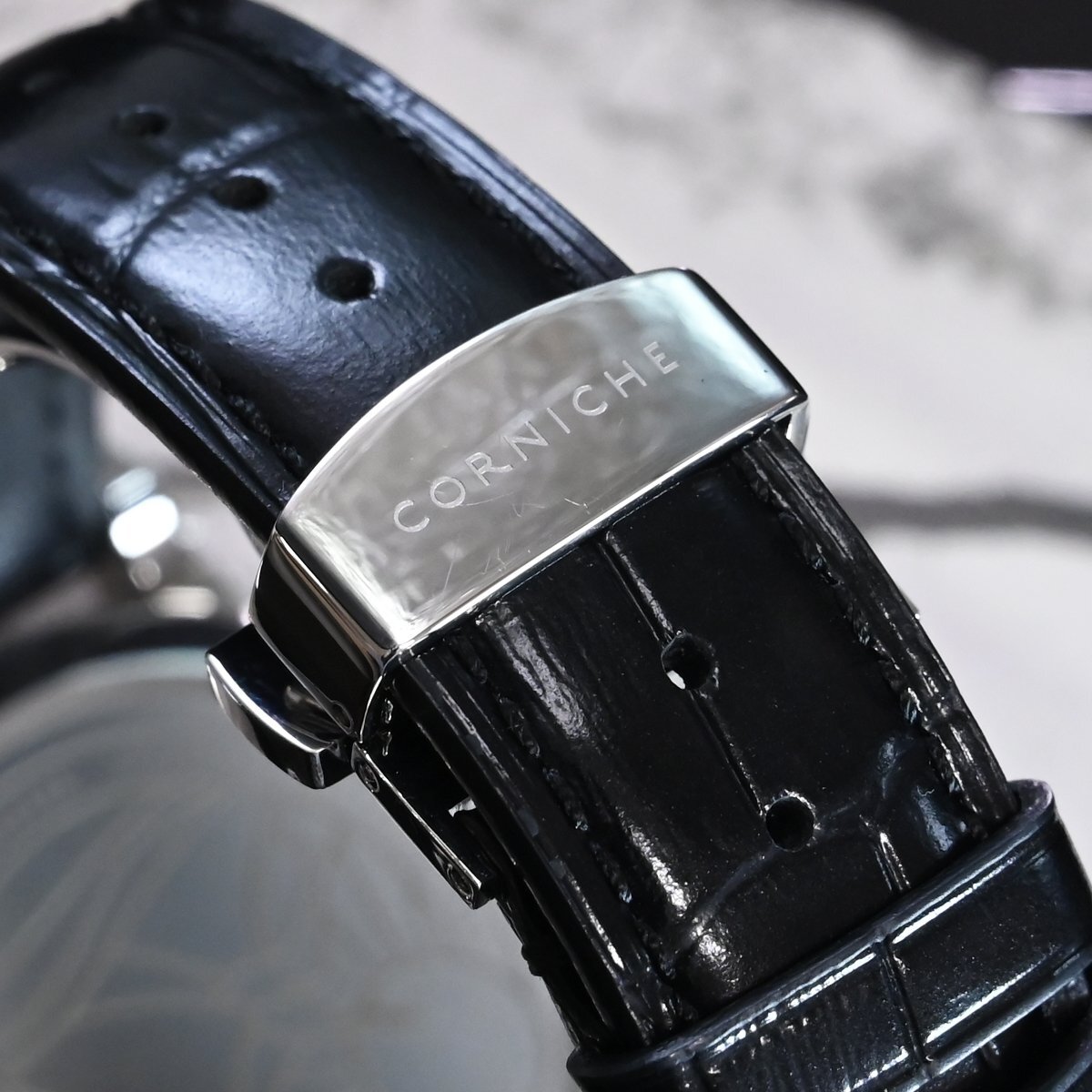 コーニッシュのスカイブルー文字盤 ブルーバード クロノグラです。 スウェーデン発のウォッチブランド「CORNICHE(コーニッシュ)」から、世界的なベストセラーシリーズである『Heritage Chronograph(ヘリテージ クロノグラフ)』の最新作「Bluebird Chronograph(ブルーバード クロノグラフ)」を発売する。 「ブルーバード クロノグラフ」はコーニッシュを象徴するブルーカラーを採用した300本限定のタイムピースで、シリアルナンバーが刻印されている。 サンレイダイアルには陽の光を浴びたような輝くスカイブルーが採用され、それを引き立てるアズールブルーの針が、モダンなタキメータースケールやアラビア数字と見事に調和し、伝統と現代をシームレスに融合している。 腕時計全体をブルーカラーでまとめ統一感のある魅力的なデザインへと仕上がった。 ケースバックにはフランスのコート・ダジュール海岸の上に聳え立つ山々に上る太陽が描かれており、フランスへのリスペクトを感じることができる。 遊び心を忘れない大人のファッションウォッチとして提案する。 すでに完売のモデルなのでお探しの方も非常に多いかと思います。 ※基本動作確認済。 |