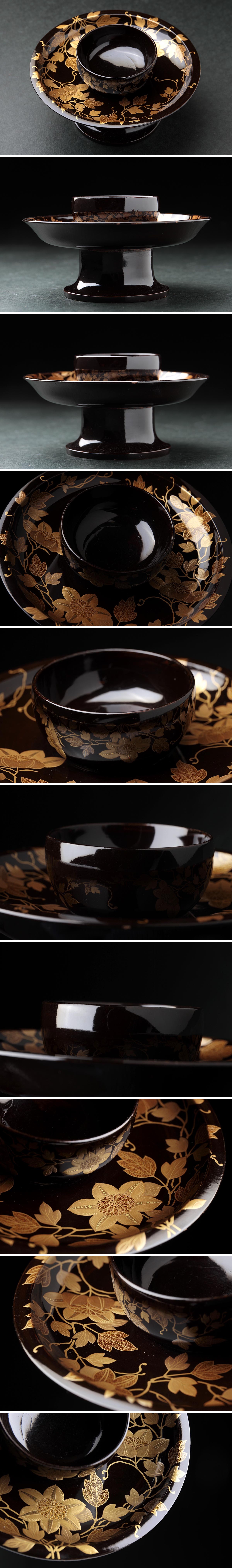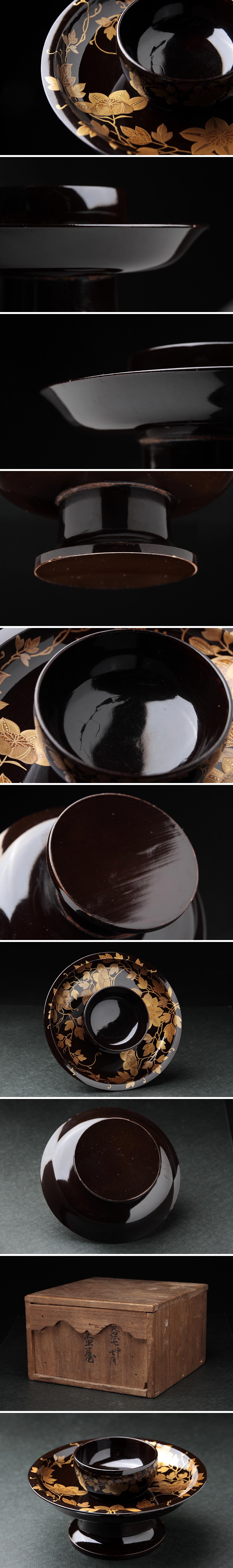 ◆ 天保 江戸期 鉄線金蒔絵盃台・鉄仙蒔絵杯台 高5.5cm/内径4.7cm 木箱附・蒔絵盃臺 漆工芸 漆器 酒器 古美術 ◆