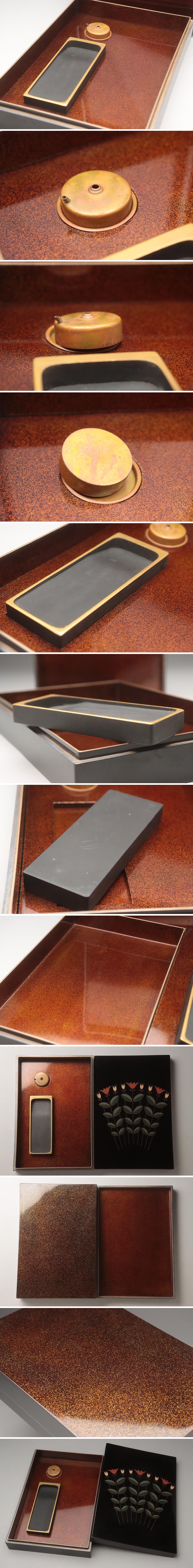 ◆ 書道具 内金梨地 黒漆塗 鬱金香蒔絵硯箱・花蒔絵硯筥 硯 水滴付 書画道具 文房四宝 漆工芸 ◆