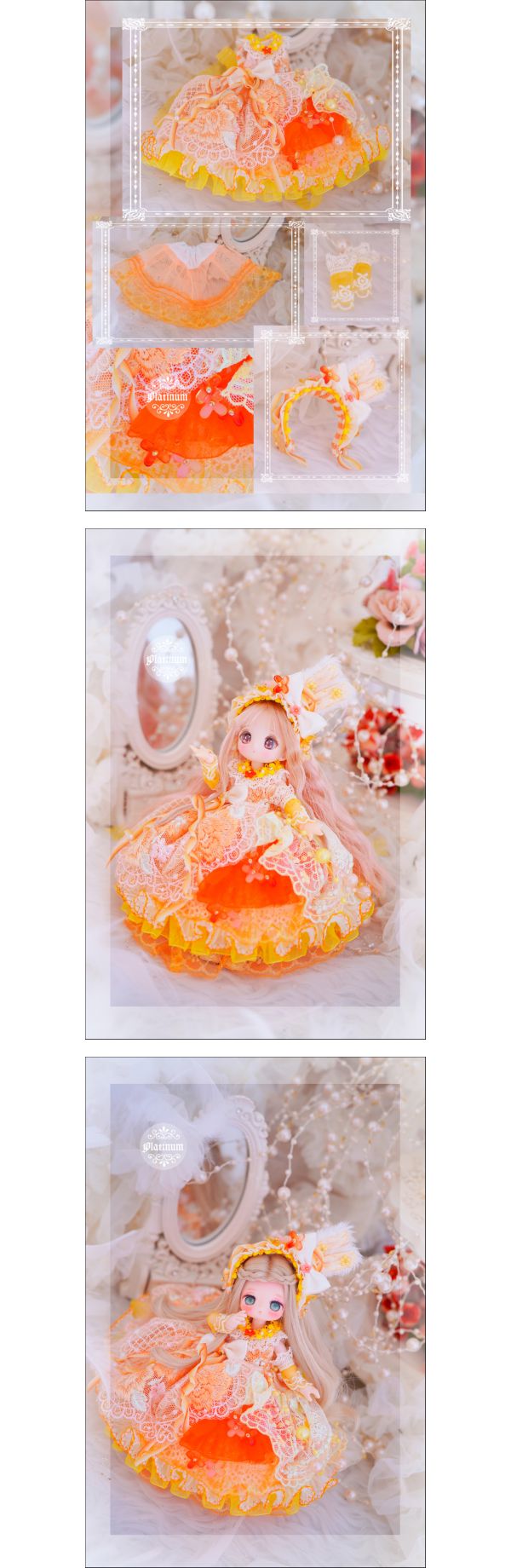ご覧いただきありがとうございます。 こちらは、オビツ11・ピコニーモPサイズのお洋服セットです。 モデルはオビツ11ボディ・OBヘッドと、ピコニーモPボディです。 一年に一度の金木犀のドレスです! オレンジベースの華やかなチュールとレモンイエロー&グリーンの爽やかなチュールを2種類重ね合わせ、各所に可愛らしい花びらを散りばめました。 良い香りがしてきそうな、元気の出そうなビタミンカラーのドレスをぜひお楽しみください。 お譲りするものは、以下のお品4点になります。 ・金木犀のドレス ・花びらとうさみみのカチューシャ ・パニエ ・アームカバー 家庭用ミシン・ロックミシン・手縫いにて作成いたしました。 リボン端などにはピケを使用しています。 ・スカート部分に何種類ものレースを使い華やかさを出しました。 後ろスナップボタン留め、全開します。 ウェストにはリボンやお花をあしらい、オレンジとイエローのグラデーションリボンを飾りました。 鮮やかなオレンジがレースの間からのぞき、そこにも小さなお花が咲いています。 ・カチューシャにはうさみみやお花、リボンがついています。 うさみみは少しだけサイドに傾けてつけています。 ・パニエはドレスの下に履き、スカートが綺麗に膨らむように形を整えてください。 ラメのはいったオレンジのレースが少し見えるようにはかせると可愛いです。 ・アームカバーはチュールです。 上部にフリルがついています。 ハンドパーツをはずしてから手首に通してあげてください。 | |||