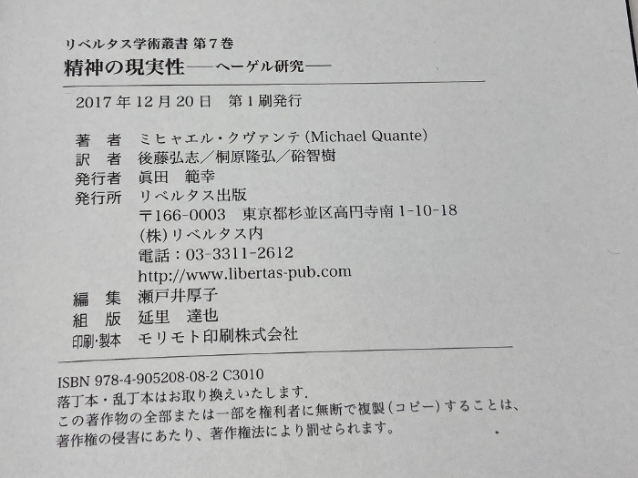 | 精神の現実性ーヘーゲル研究 (リベルタス学術叢書 第 7巻) リベルタス出版 ミヒャエル・クヴァンテ | |