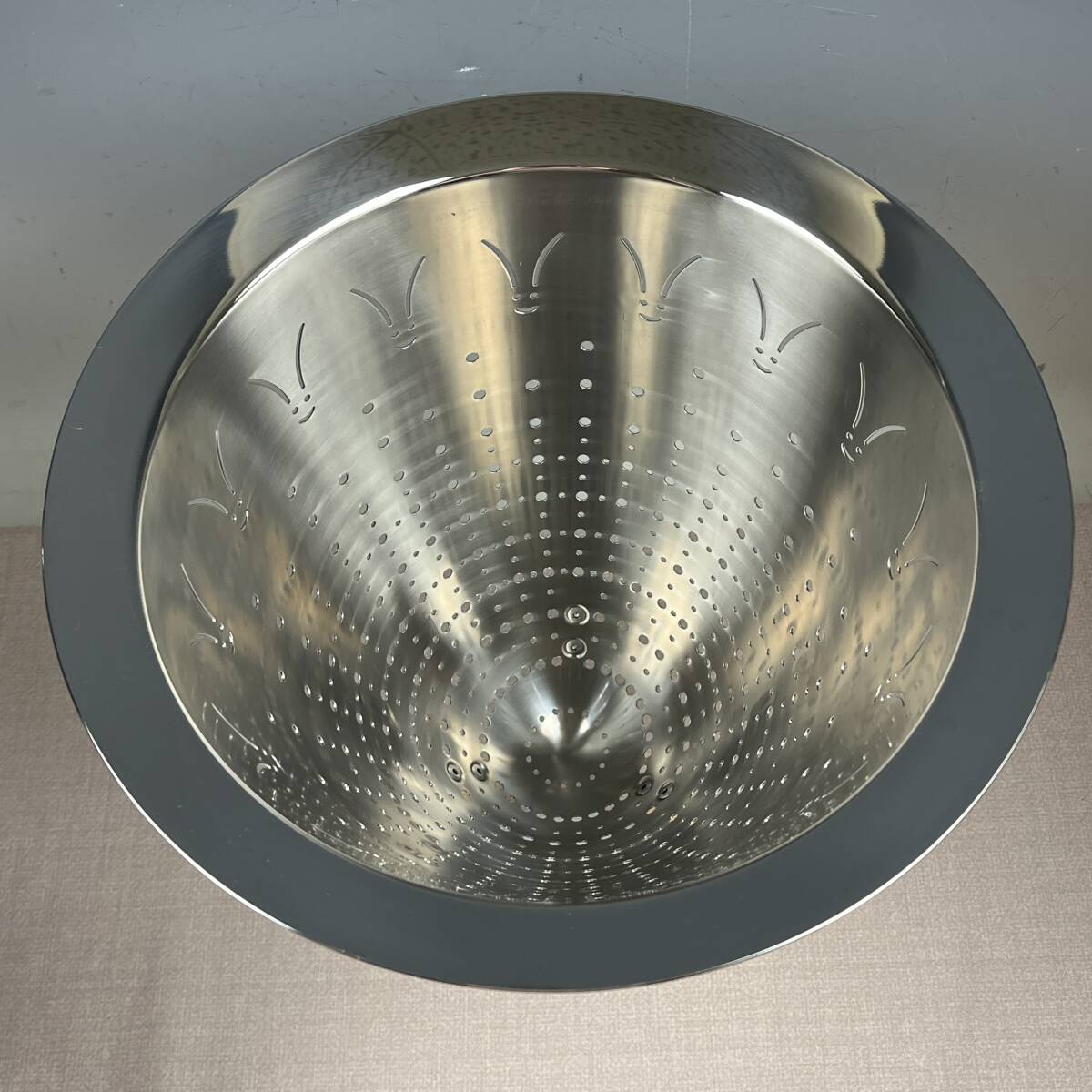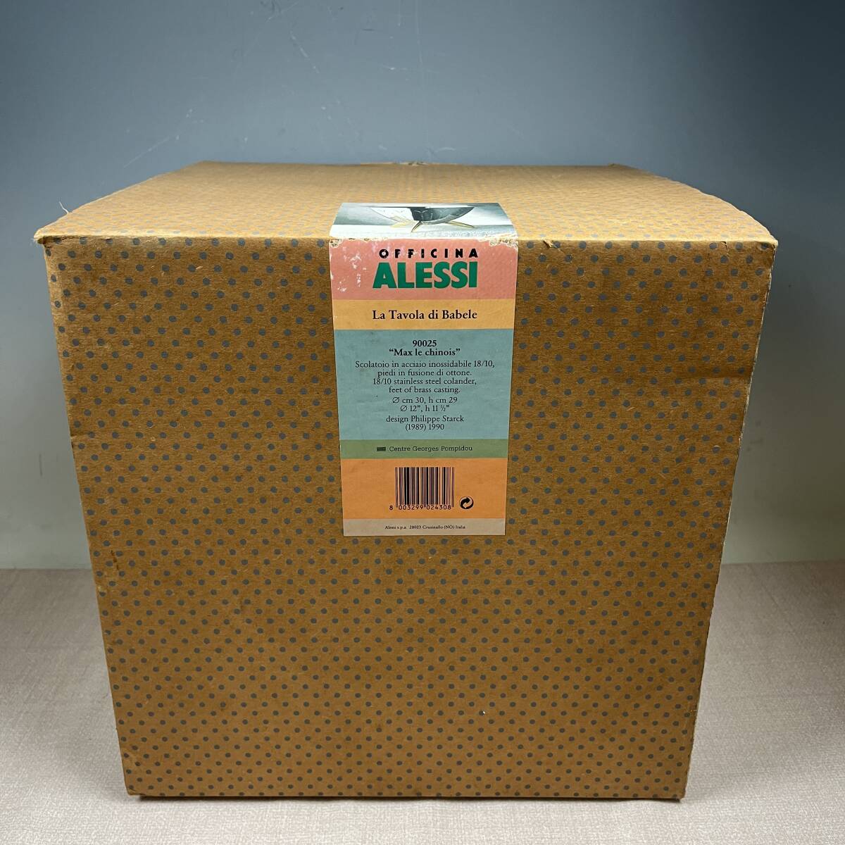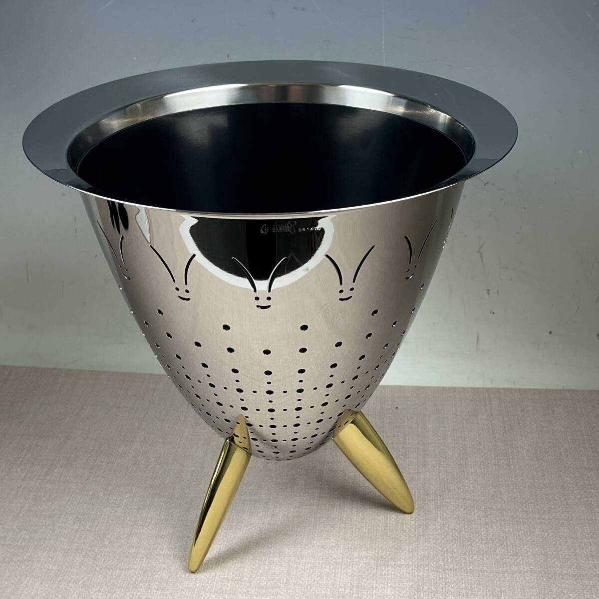★商品管理番号 43-6783 ★商品名 アレッシィ ALESSI マックス・ル・シノワ MAX LE CHINOIS フィリップ・スタルク コランダー ステンレス製 水切りボウル 脚付 参考価格¥68,139 ★サイズ 約 W30 x D30 x H30 cm ★商品説明 1921年に金属製品を手掛ける工房として創業したイタリアのテーブルウェアブランド、ALESSI(アレッシィ)。 現在では世界的に有名なデザインプロダクトブランドとして、さまざまなデザイナーとともに多彩な製品を生み出しています。 フィリップ・スタルク デザインのコランダー=水切りです。 周囲にたくさんの小さな穴が開いているので、水洗いした野菜や茹でたパスタなど使い方は様々 水切り用のボウルとしても使用できますが、内側に付いているカバーを使えばワインクーラーや花瓶として植物を入れることも可能 そのまま飾っておいてもオブジェのような存在感 ★商品状態 長期保管品です。 未使用かと思いますが、多少のスレなどございます。 画像に写ってる物が全てです。 外箱は経年変化にてスレ・キズ・汚れ等があります。 ※出品依頼商品に付き、詳しい質問等のお答え出来ない場合がございますので、ご了承下さい。 ※評価後の返品&返金は一切受け付けません。予めご了承ください。 ★発送方法 手渡し大歓迎です。 おてがる配送 宅急便(EAZY)送料込み ※領収書を希望される方は、落札後取引メッセージにご連絡下さい。 ※落札後、評価不要の場合は評価は入れない様にお願い致します。 ※当社の詳しい所在地はこちらのホー ムページをご覧下さい。 | ||||