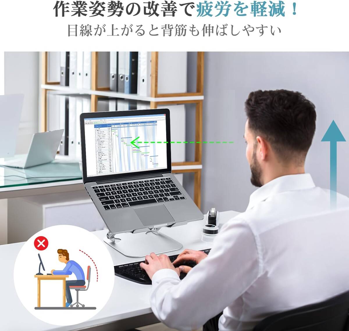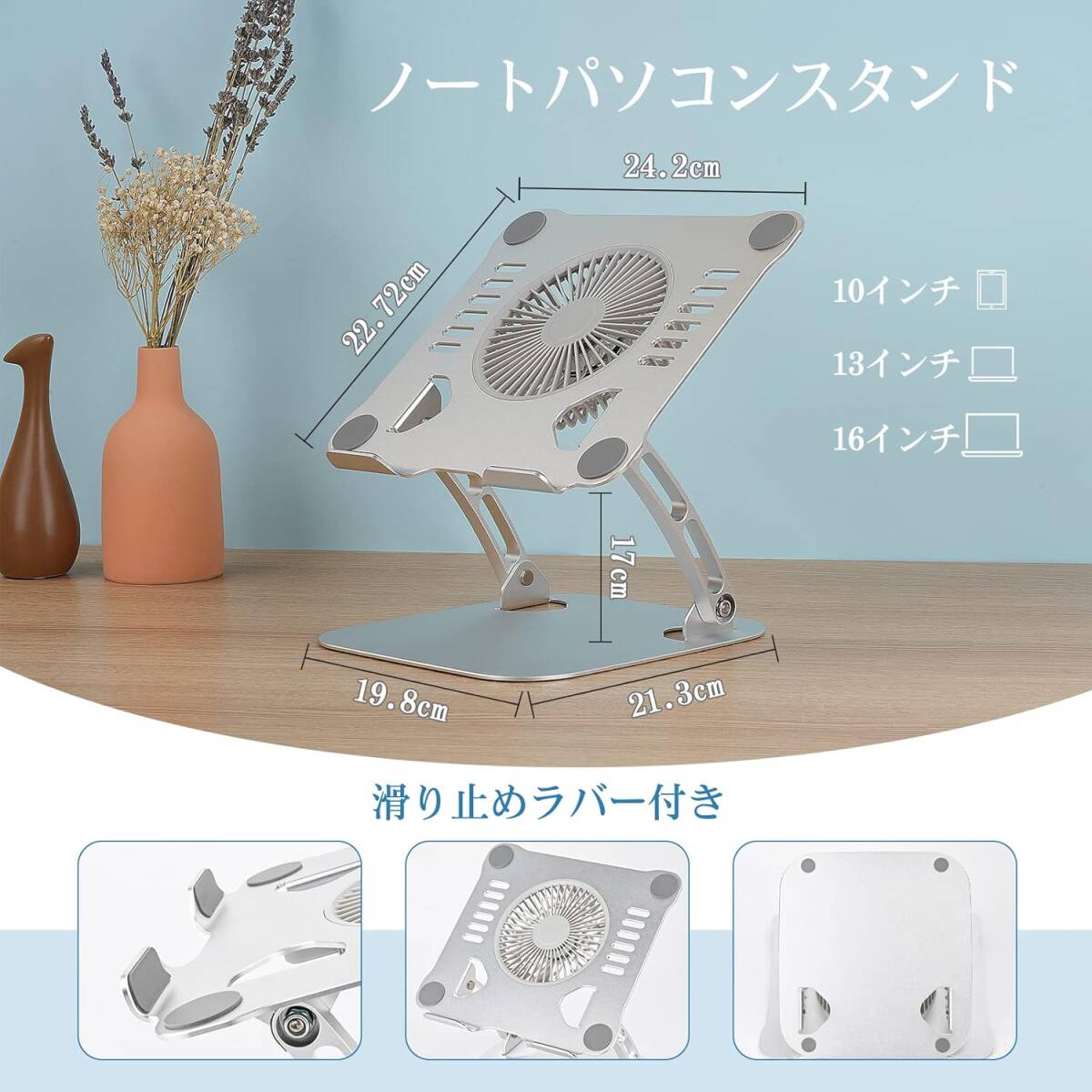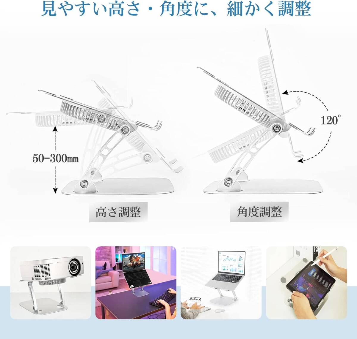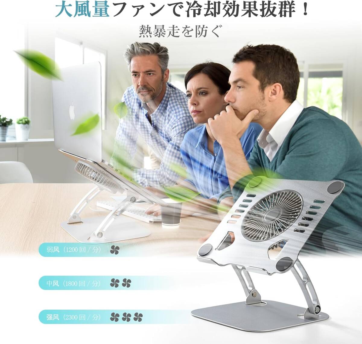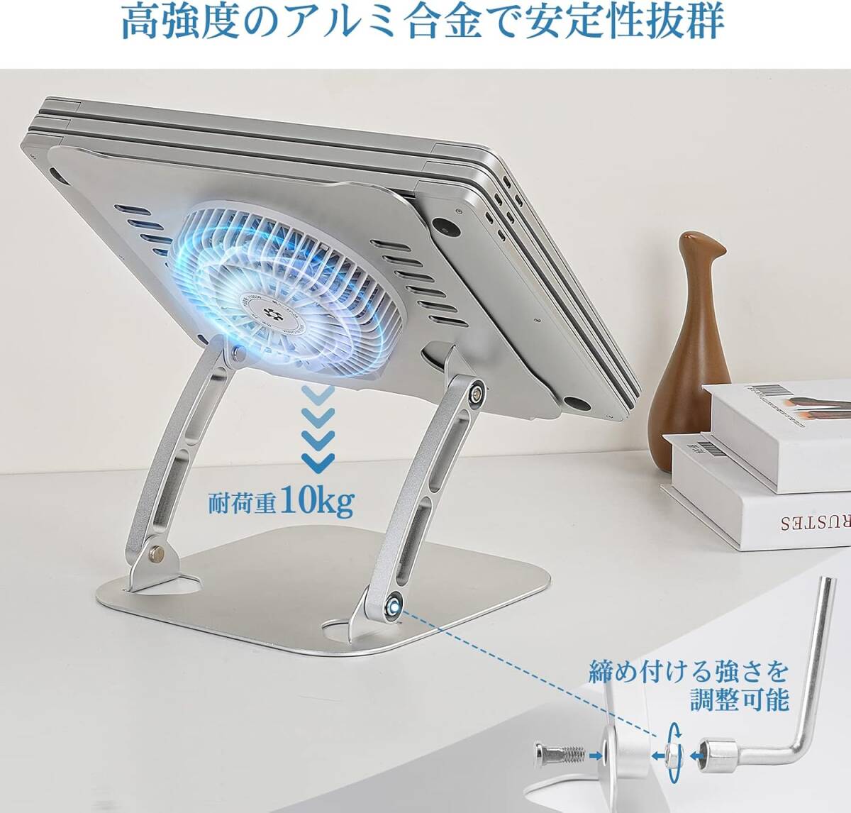 【大風量冷却ファンを搭載で1台2役】SHUWEIノートパソコン冷却スタンドは3段階(1200rpm/1800rpm/2300rpm)の風量調整ができる冷却ファンを搭載され、ノートパソコン冷却台と卓上扇風機として使用できます。パソコンの過熱を防ぎながら、作業環境を涼しく快適に保ちます。さらに、放熱を助けることで、パソコンの性能を最大限に発揮させ、効率的な作業を実現します。 【革新的な360°回転デザイン】SHUWEIノートパソコンクーラーは従来品に比べ、360°自由に回転でき、スクリーン共有が簡単に。チームでの共同作業やプレゼン、どの角度からでも内容を見せたい時にぴったりです。オフィスでのディスカッションや、家族との動画共有もスムーズに。 【高強度のアルミ合金で安定性抜群】耐荷重10kgまで対応し、高強度のアルミ合金素材を使用したパソコンスタンドは、安定性と耐久性が抜群です。レンチで締め付ける強さを調整可能で、お好みの固定力にカスタマイズできます。重いデバイスもしっかり支え、安心して使用できる頼れるスタンドです。 【見やすい高さ・角度に、細かく調整】このノートpcスタンドは角度・高さを無段階で調整できるので、お好みの位置でipadや液タブ、プジェクターも使用できます。高さ調節は無段階で、5cmから30cmまで変えられます。動画視聴時やipad絵描き時、ワイヤレスキーボード使用時などあらゆるスタイルでの使用に適しています。 【対応機種と滑り止めラバー】最大16インチノートパソコン対応のpcスタンドで、幅広いデバイスに対応します。パソコンスタンドの爪の内側・表面・底部共に10個の滑り止めパッド付きで、デバイスとスタンドの安定性を高めます。これにより、パソコンとデスクの傷付きは心配がなく、安心して作業ができます。