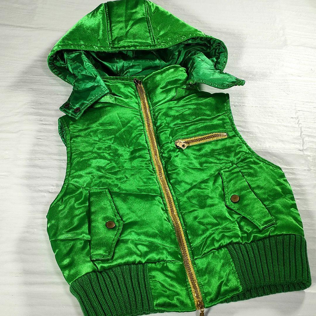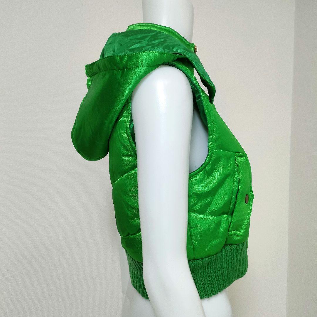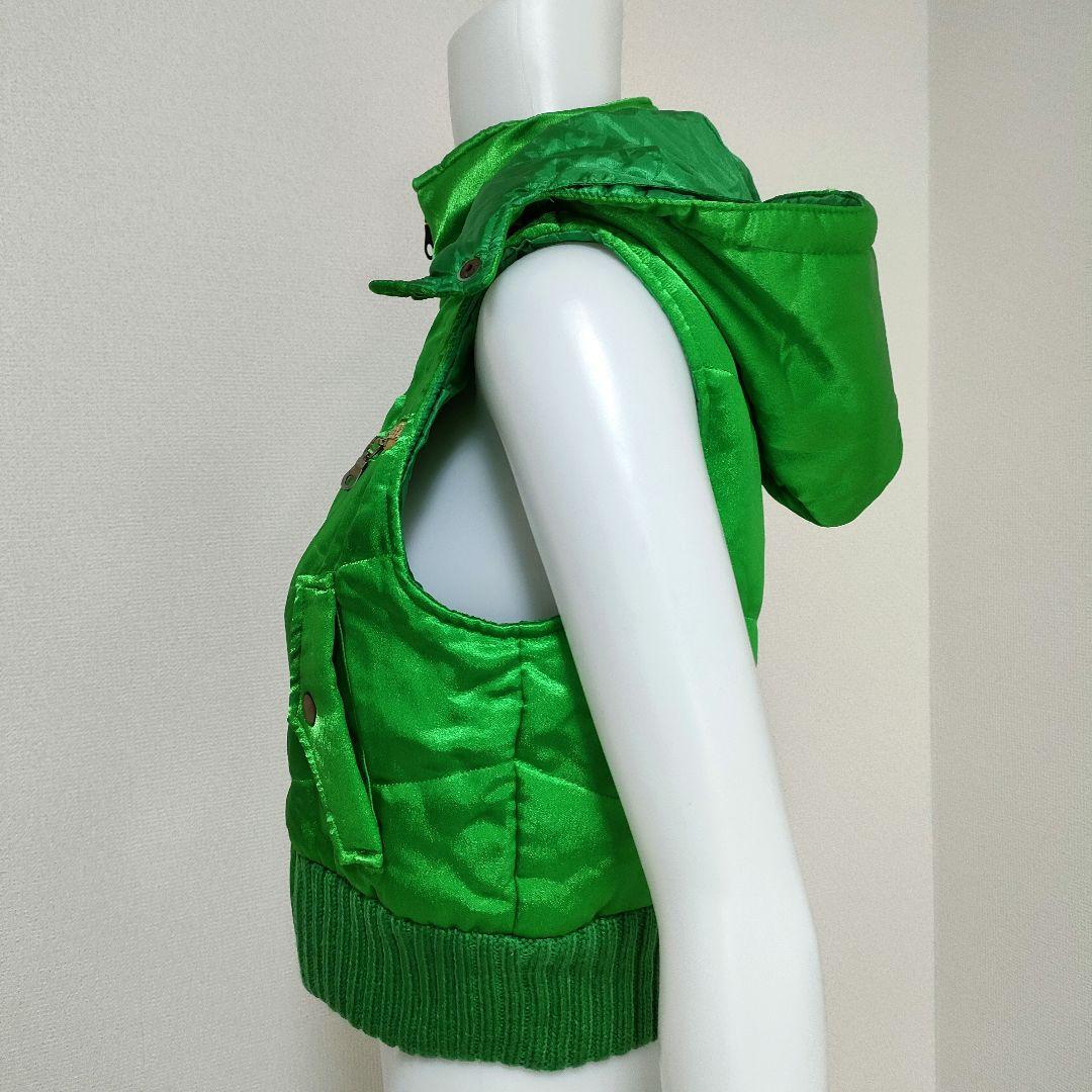 目を引く鮮やかなグリーンカラーが特徴的なU.D.Aのフード付きベストです。
