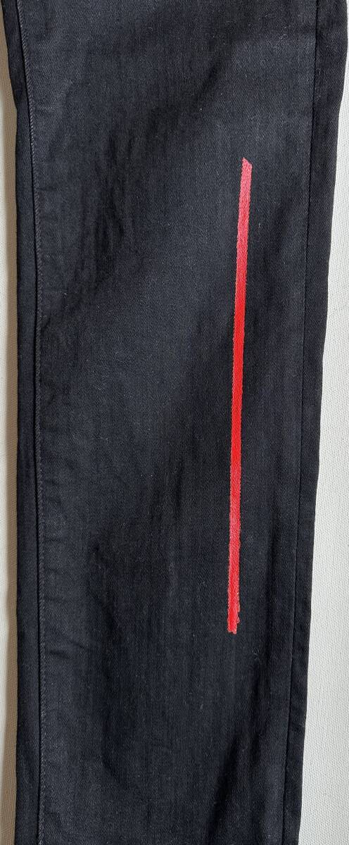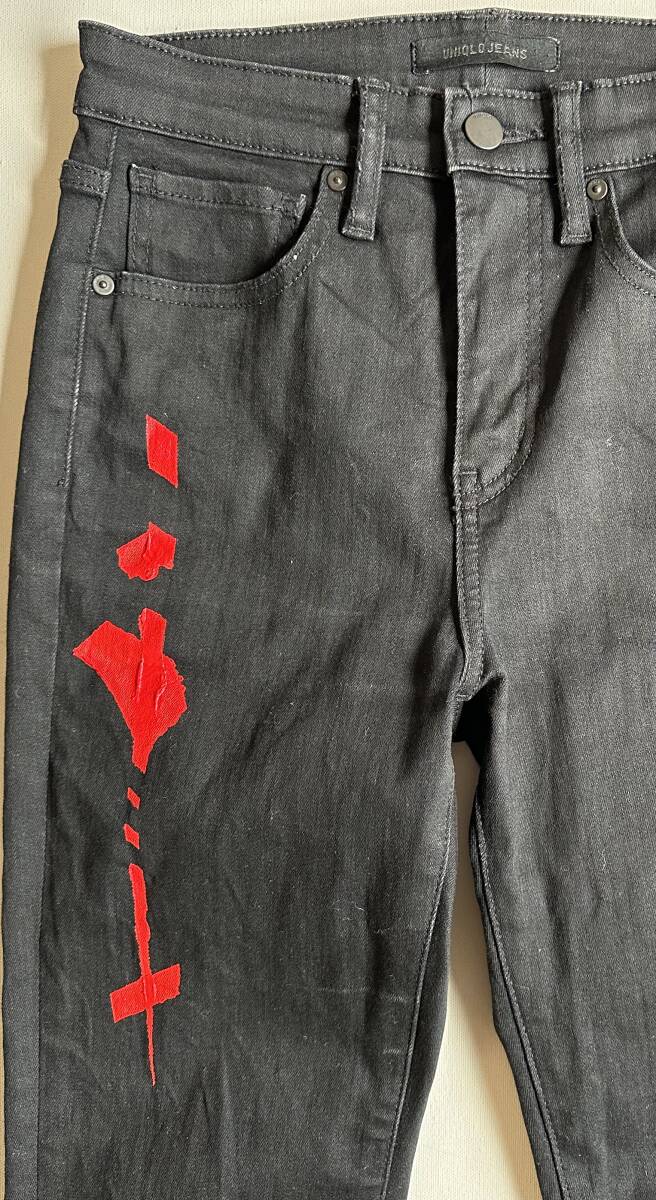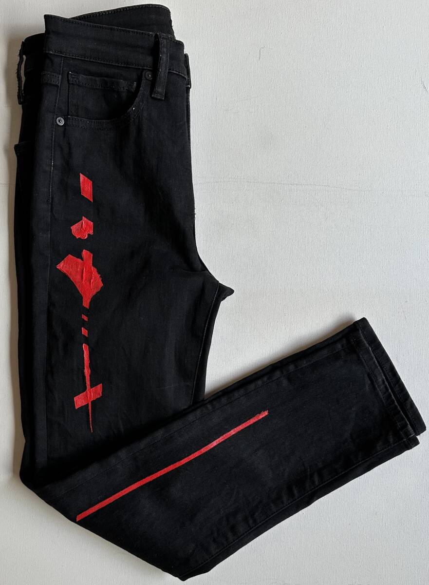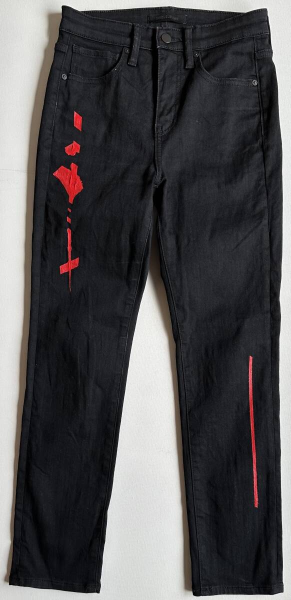UNIQLO JEANS アンクル丈レッドレッドパターンジーンズ25 美品です。サイズ:25 ウェスト63.5cm。股上(前25.5cm・後29.5cm)股下65cm。ヒップ39cm。ワタリ幅20cm。裾幅15cm。マテリアル:本体は綿68%+リヨセル28%+ポリウレタン4%。当方がアクリル絵の具にてラインを描きましたが一部滲み等がございます。アフターケアは基本的には優しく手洗いで脱水機はOKですが乾燥機はアクリル絵の具に負荷を掛けるのでNGです。状態は10段階で7位です。ご理解頂ける方のみノークレーム・ノーリターンでお願いします。