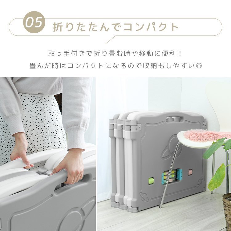 ママにも簡単に組み立てられるベビーサークルです。 赤ちゃんの脳の発達を助けるトイパネルも付いています。 工具不要で組み立て簡単! お好みの形に広げて接続部分のキャップを締めて固定するだけ! 外側から扉をロックすることができるので お子様が勝手に外へ出てしまう危険性がありません。 お手入れはサッと拭くだけ! 組み立てたまま拭けるのでお手入れも簡単! いつでも清潔を保てます。 簡単に取付けできる拡張パネル2枚セット付きも販売中! 【商品内容】 パネル ×10枚(おもちゃパネル ×1、扉パネル ×1、パネル ×8) 【商品詳細】 カラー:ブルー×ホワイト 対象年齢:6ヶ月から8歳頃まで 素材:ポリエチレン 【サイズ(約)】 長方形:112×120cm(内寸:108×109cm) 長方形(縦長):151×80cm(内寸:145×74cm) 円形(直径):136cm(内寸:133cm) L字:111×121cm(内寸:105×115cm) 折りたたみ時:73×60×厚さ21cm ※誤差±2~3cm ■専用拡張パーツは こちら |