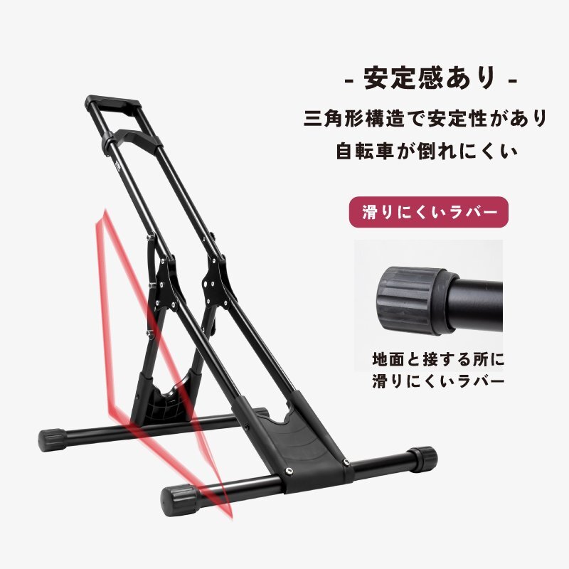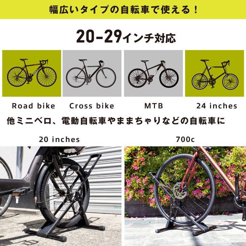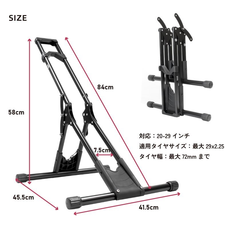 スライドして様々な自転車に合わせる20-29インチまで対応する自転車スタンドです。 ロードバイクからクロスバイクやMTB、ピスト、BMX、小径車、子供用自転車、電動自転車など様々なタイプの自転車にお使い頂けます。 使い方はとても簡単でタイヤを差し込みスライドでホイールサイズに合わせて駐輪完了です。 またスタンドは安定性があり倒れにくくなっています。 使わない時は折りたたんでコンパクトになるので保管場所にも困らない。 また車での輸送など持ち運びにも便利なスタンドとなっています。 [差し込むだけ] タイヤを差し込むだけの作業で駐輪できる。とても簡易で素早く自転車をスタンドに入れる事が可能。 シンプルな使い方なので初心者の方でも安心。安定性も十分あります。 [スライド調整] スタンドの一部を自転車のタイヤに合わてスライドして調整できるので様々なホイールサイズにしっかりと対応します。 [幅広い自転車に対応] 20インチから29インチまで対応。 ロードバイク、クロスバイクやマウンテンバイク、小径車、ミニベロ、また子供用自転車まで様々な自転車に適合します。 [安定感あり] 三角形構造で安定性があります。自転車が倒れない。 [折畳みできる] 使わない時は邪魔にならないように折りたたんで隅の方に保管する事ができる。 コンパクトになるのでイベントなどで使うために車に載せて持ち運びもできる。 折りたたむ場合はねじを二カ所とる必要があります。 [高品質] 丈夫で品質の良い金属フレームでできている為、耐久性に優れ錆びにも強くなっています。 商品内容自転車用スタンド、組立用工具、説明書 サイズ商品画像をご参考下さい。 対応20-29インチ ロードバイクからクロスバイク、マウンテンバイク、折り畳み自転車、子供用自転車等ほとんどの自転車タイプに適用 適用タイヤサイズ最大29x2.25 タイヤ幅最大72mmまで 前輪、後輪とも使用可能(後輪での駐輪時は自転車タイプによってはプーリーケージが干渉する可能があります) 商品は入荷によりキズがある場合があります。 傷や細かい汚れが気になる方や神経質な方は入札をお控え下さい。 入荷時期により予告無く一部仕様変更する場合が有ります。 カラーはディスプレイ種類環境等により実物と異なって見える場合がございます。 |
