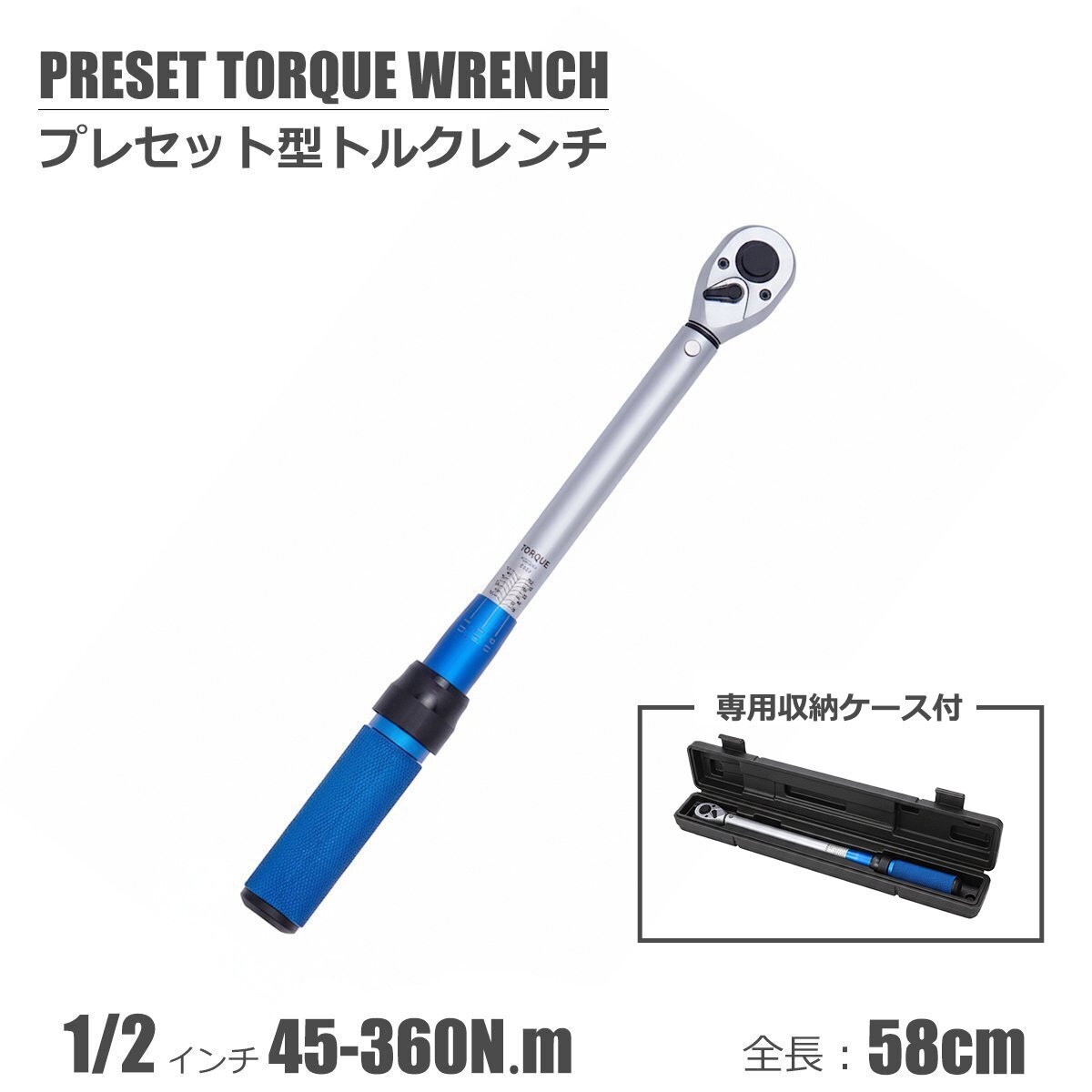 | 商品仕様 | 【差し込み角】 ・1/2(12.7mm) 【測定範囲】 ・45-360N・m 【測定精度】 ・±3以内 【収納ケース】 縦:約600mm×横:約75mm 【トルクレンチ本体】 縦:約575mm×横:40mm 【カラー】 ・本体:シルバー ・グリップ:青 |