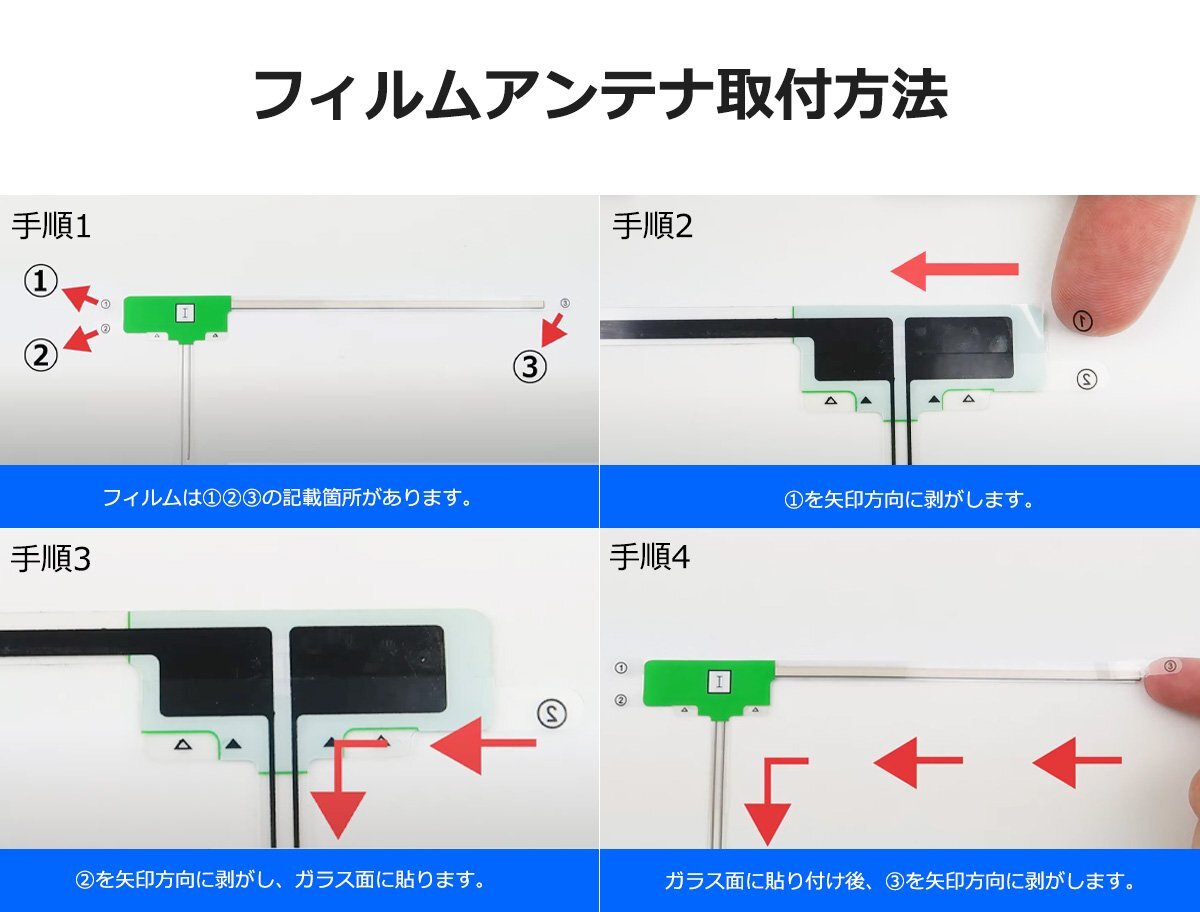 | セット内容 | ■アンテナコードx4本 ■フィルムアンテナx4枚(左右2枚 2セット) ■コードクランパーx4個 ■取り付け説明書 |