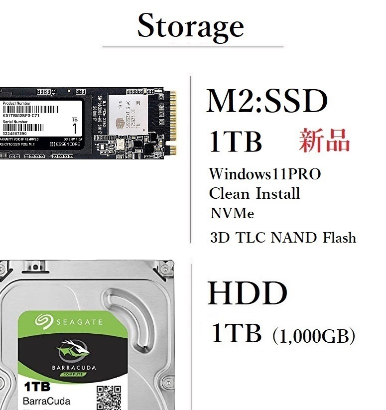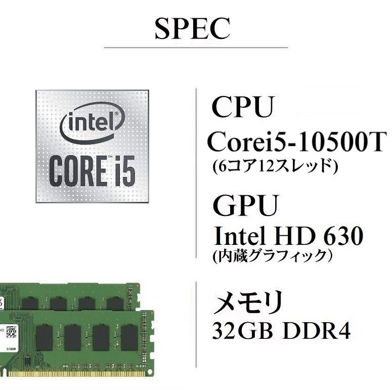CPU::Corei5-10500T メモリ:32GB SSD: 新品M2:SSD1TB HDD: HDD-1TB DVD:DVDドライブ WIFI:USB-無線LAN デュアルバンド 2.4GHz 150Mbps/5GHz 433Mbps BT:USB-Bluetooth4.2 Office:Office2024ProPlus OS:Windows11Ppo Windows10と同様にOffice2016 . 2019も10/14でサポートが終了しています