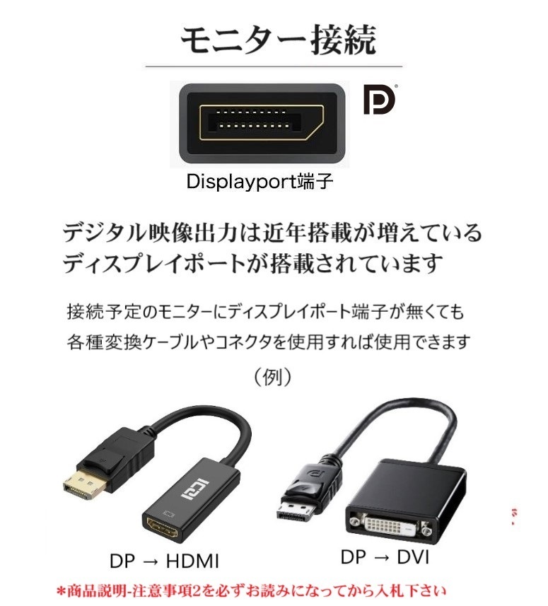 当方出品PCにディスプレイポートが搭載知れている物 (グラボ含む) については 仕入れ先、及び当方にてそれぞれで出力確認(ダブルチェック、双方の違うモニター、ケーブル)を行っています USB端子等と違い、一般的にモニタの接続端子は一度モニターとつないだら毎回抜き差しはしません 当方のベースとなるビジネスPCも同様にリース時と仕入れ先、当方とせいぜい10回程度の抜き差しなので端子不良はほぼありません