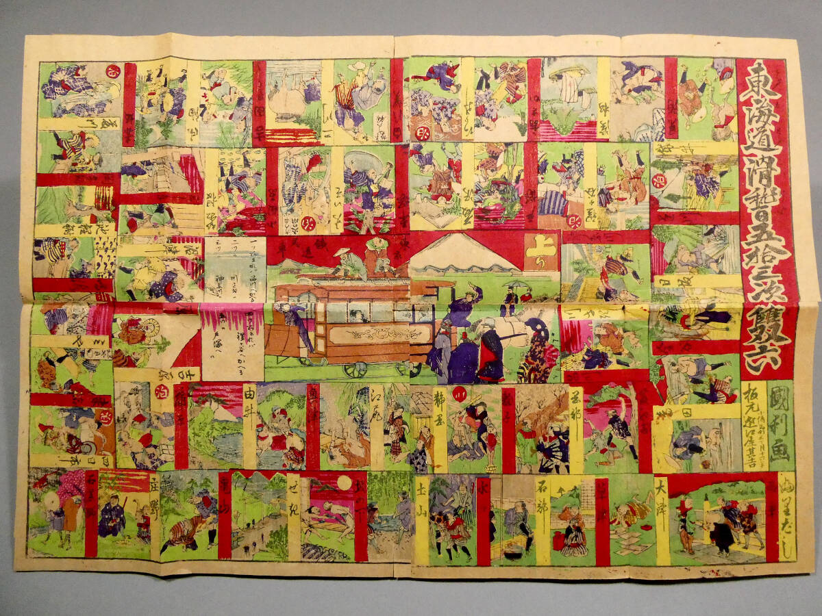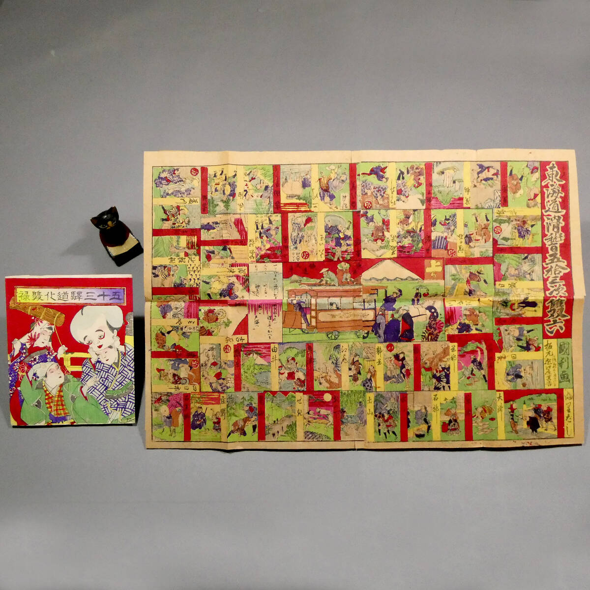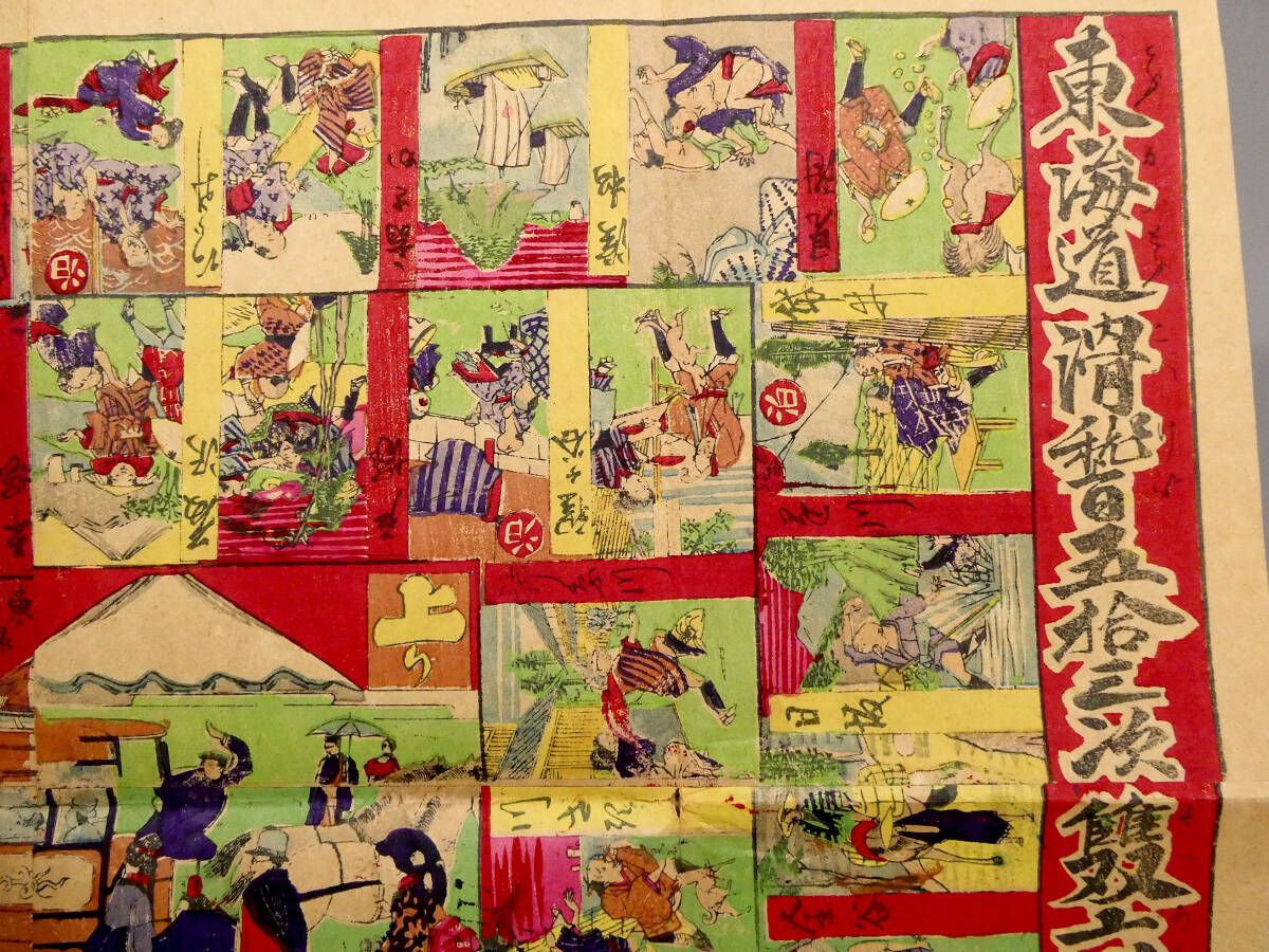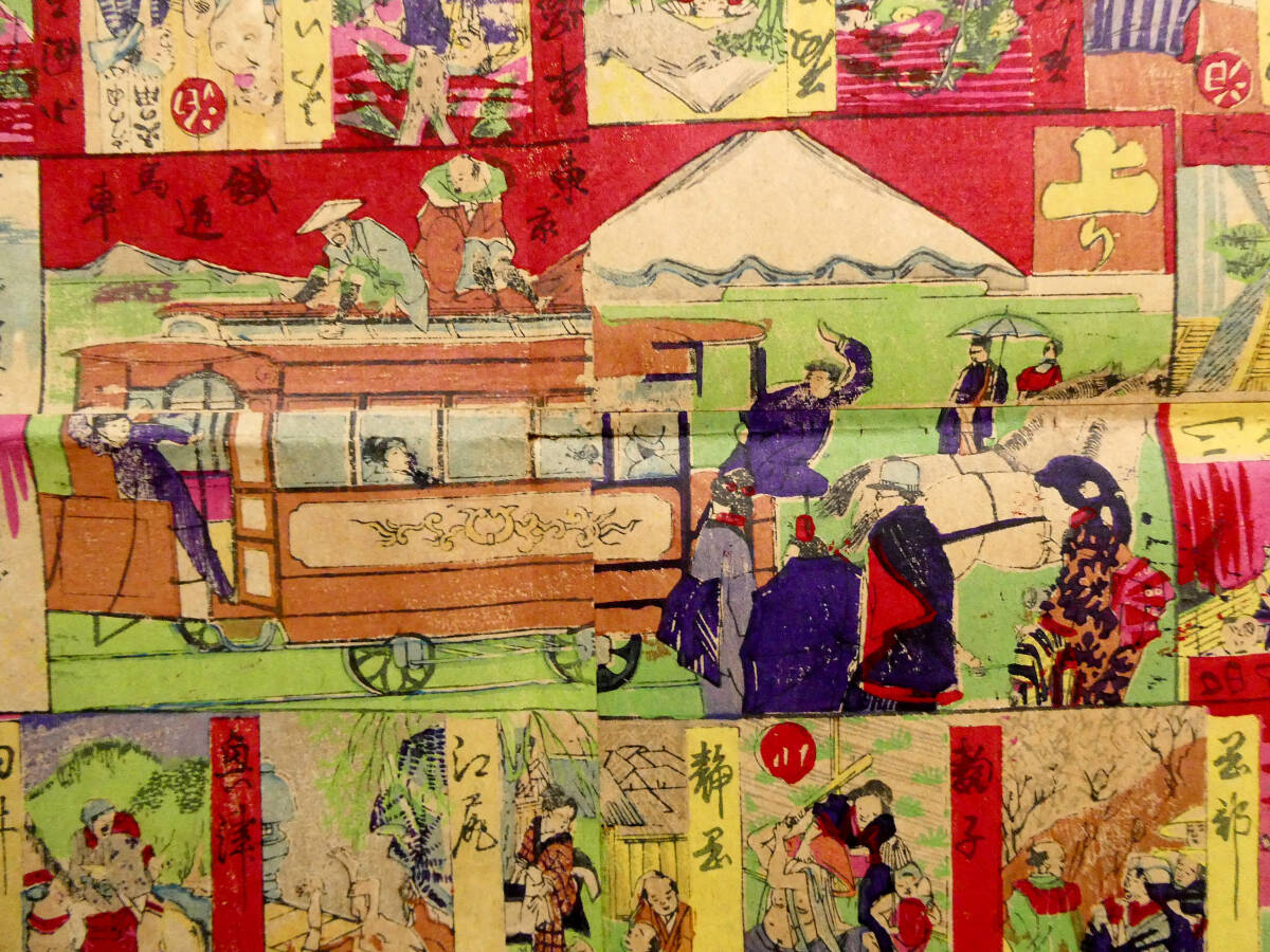 ■ 歌川国利 明治時代 木版浮世絵 双六 「東海道滑稽五拾三次双六」 上りは東京 鉄道馬車 包み付き ■