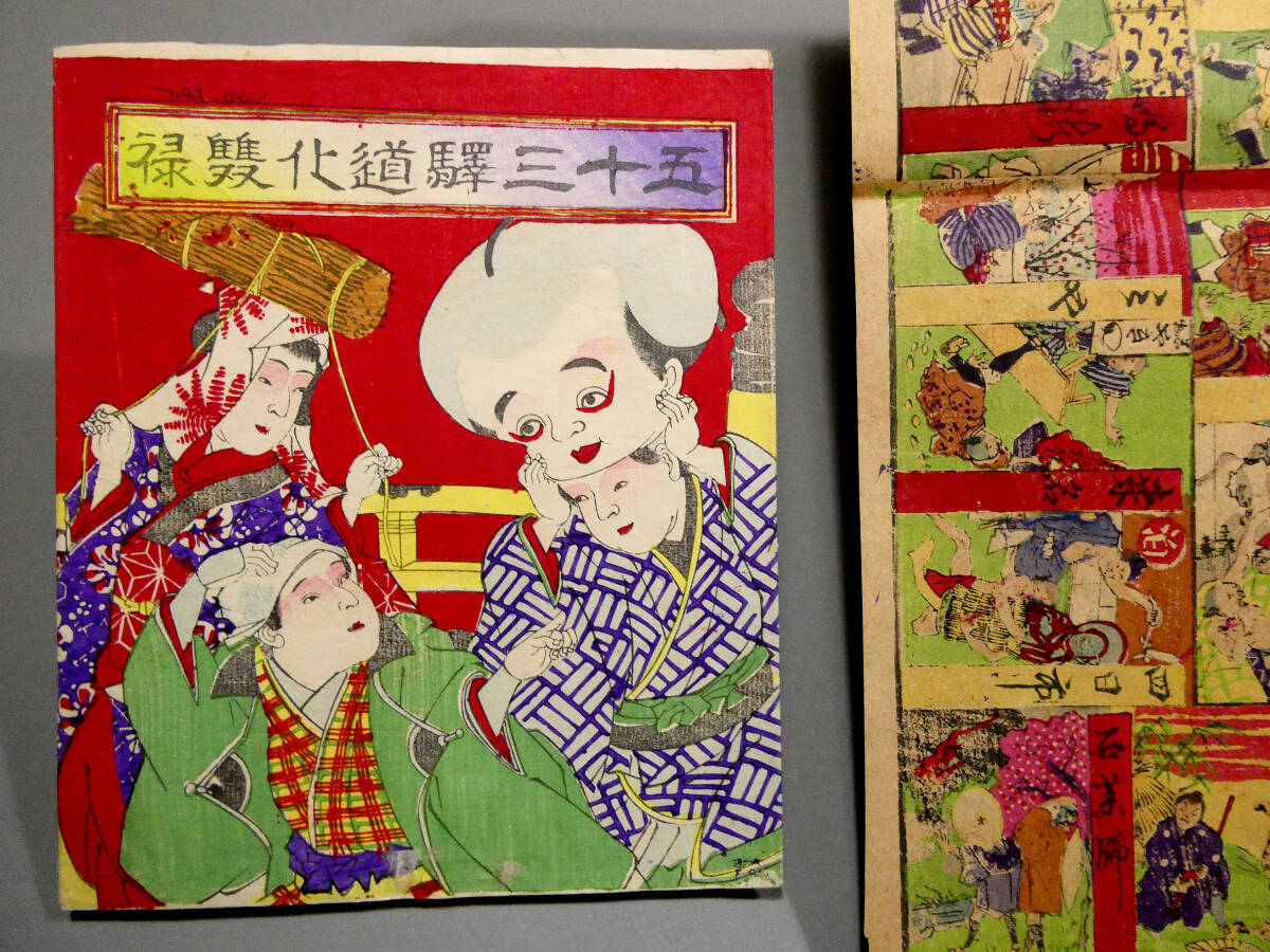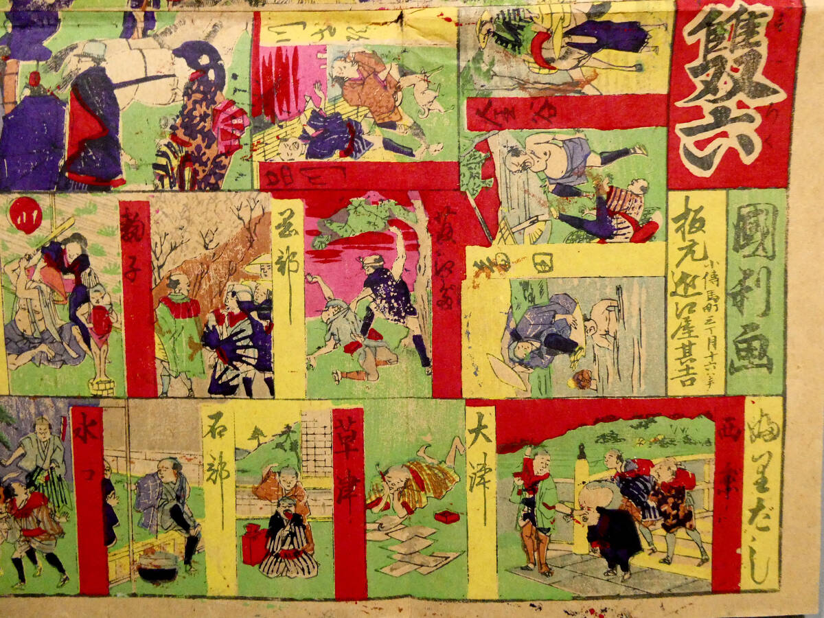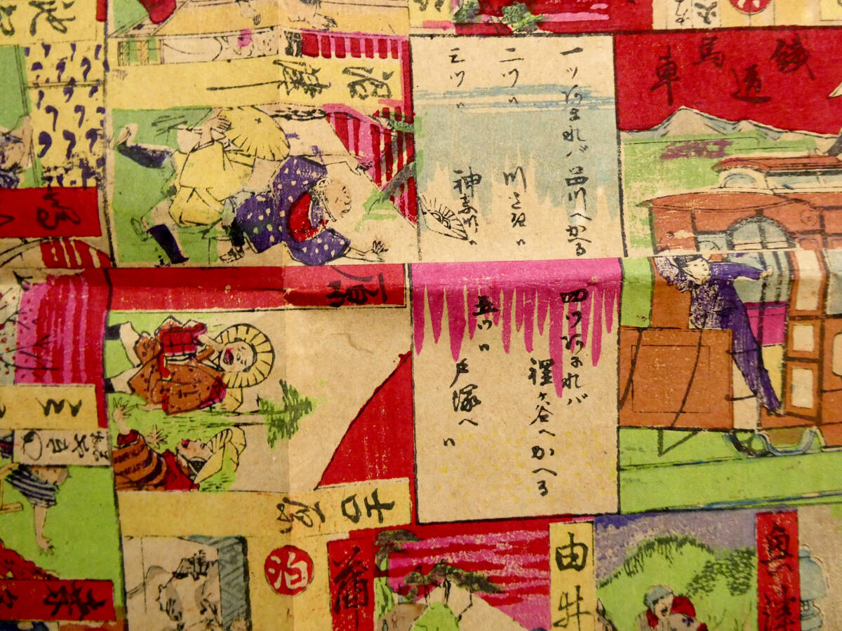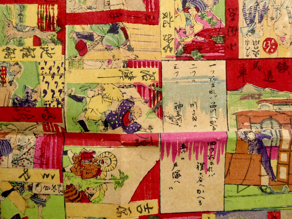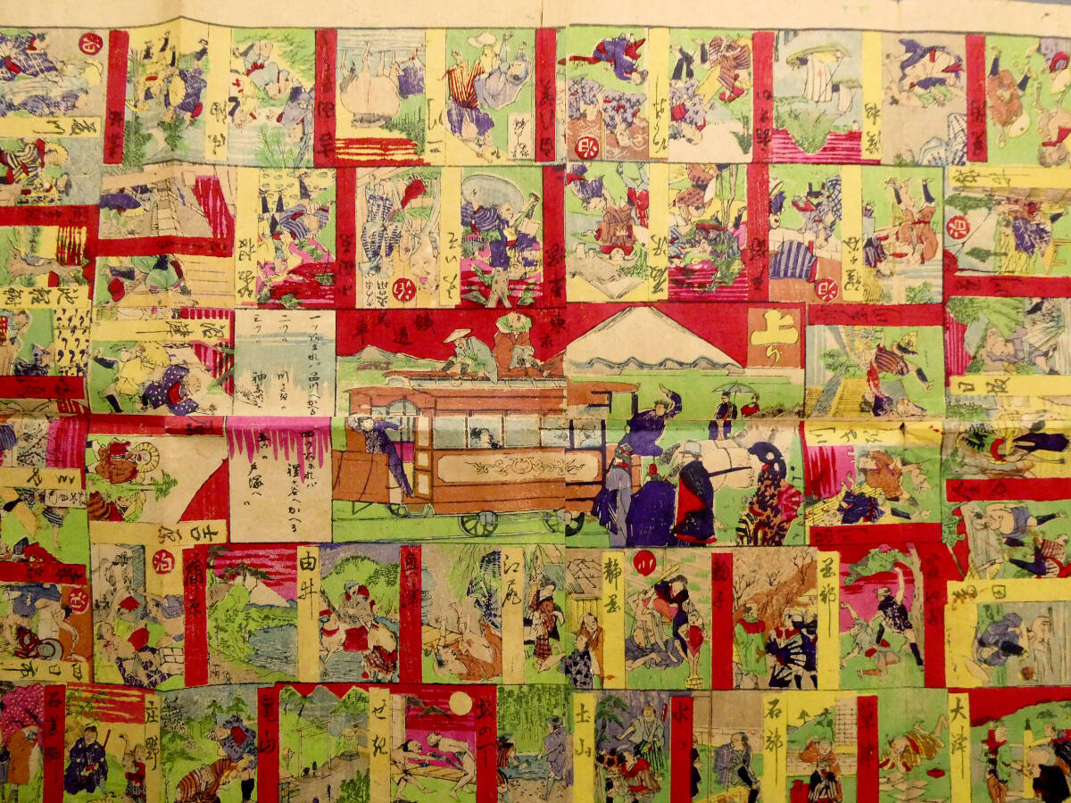 ■ 歌川国利 明治時代 木版浮世絵 双六 「東海道滑稽五拾三次双六」 上りは東京 鉄道馬車 包み付き ■