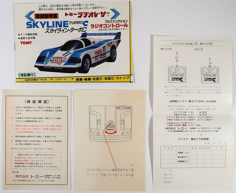 出品は画像の物の物が全てです。他に必要なものはご自分でご用意ください。箱は多少の凹み、汚れや傷はあります。説明書に折れ目や破れがあります。使用品ですので擦り傷や汚れが有ります。車体の外観を見る限りは、中古としてみれば状態はいいです。ただ白いボディーの変色はあると思います。ステッカーも多少は剥がれそうな箇所もあります。電池を入れて動作チェックしましたが、動作はしませんでした。プロポの方はLEDライトはつきました。そのほかに私が確認する限りはひどい破損は確認出来ませんでした。分かる事は以上です。お取引後は一切のサポートはしておりません。このような状態ですので、お取り引き後に返品は出来ませんしクレームもお受けできません。