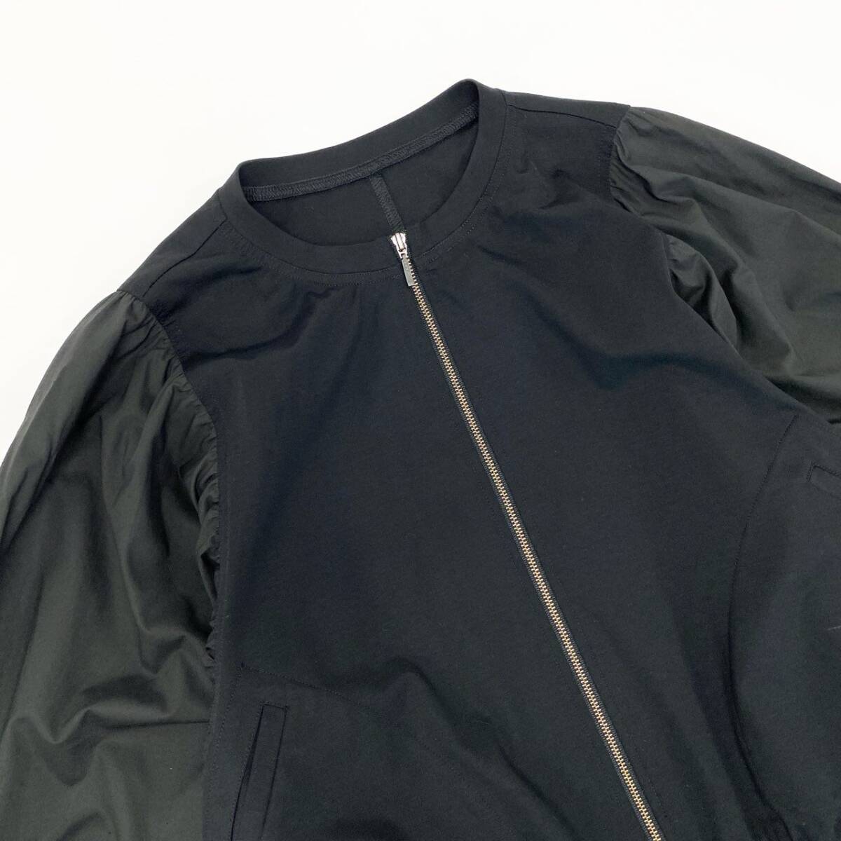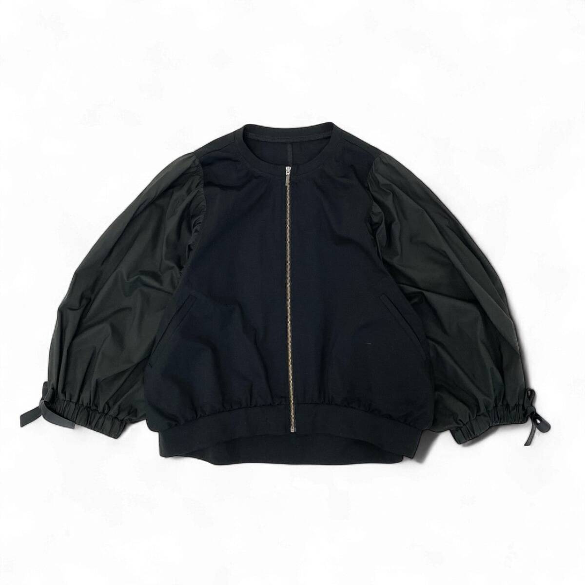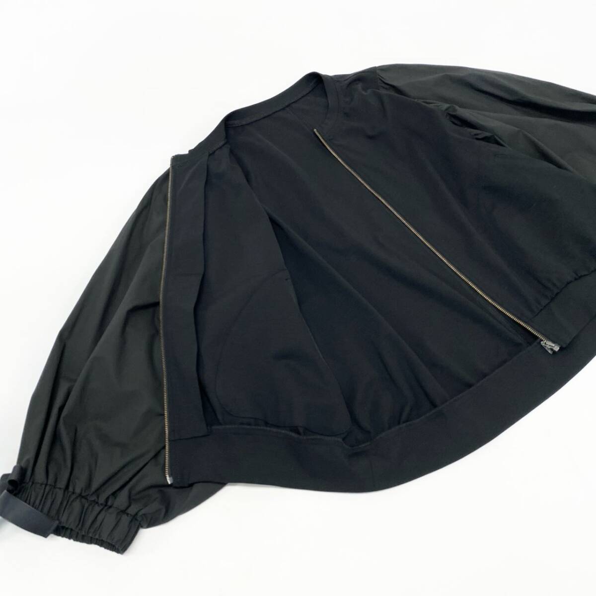 | スタッフ商品コメント | トクコプルミエヴォルらしいボリューム感のあるドルマンスリーブデザインが魅力のノーカラーブルゾンです。カラーは深みのあるブラックで、身頃はマットなコットン風、袖はわずかに光沢のあるナイロン調素材を用いた異素材切替がポイント。袖口にはリボン結びのドローストリングが施され、シルエット調整が可能。フロントは使いやすいフルジップ仕様で、軽アウターとしてデイリーに取り入れやすい一着です。ワイドパンツやロングスカートとも相性が良く、コーデに立体感をプラスします。 |