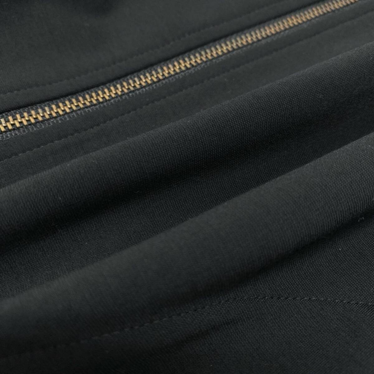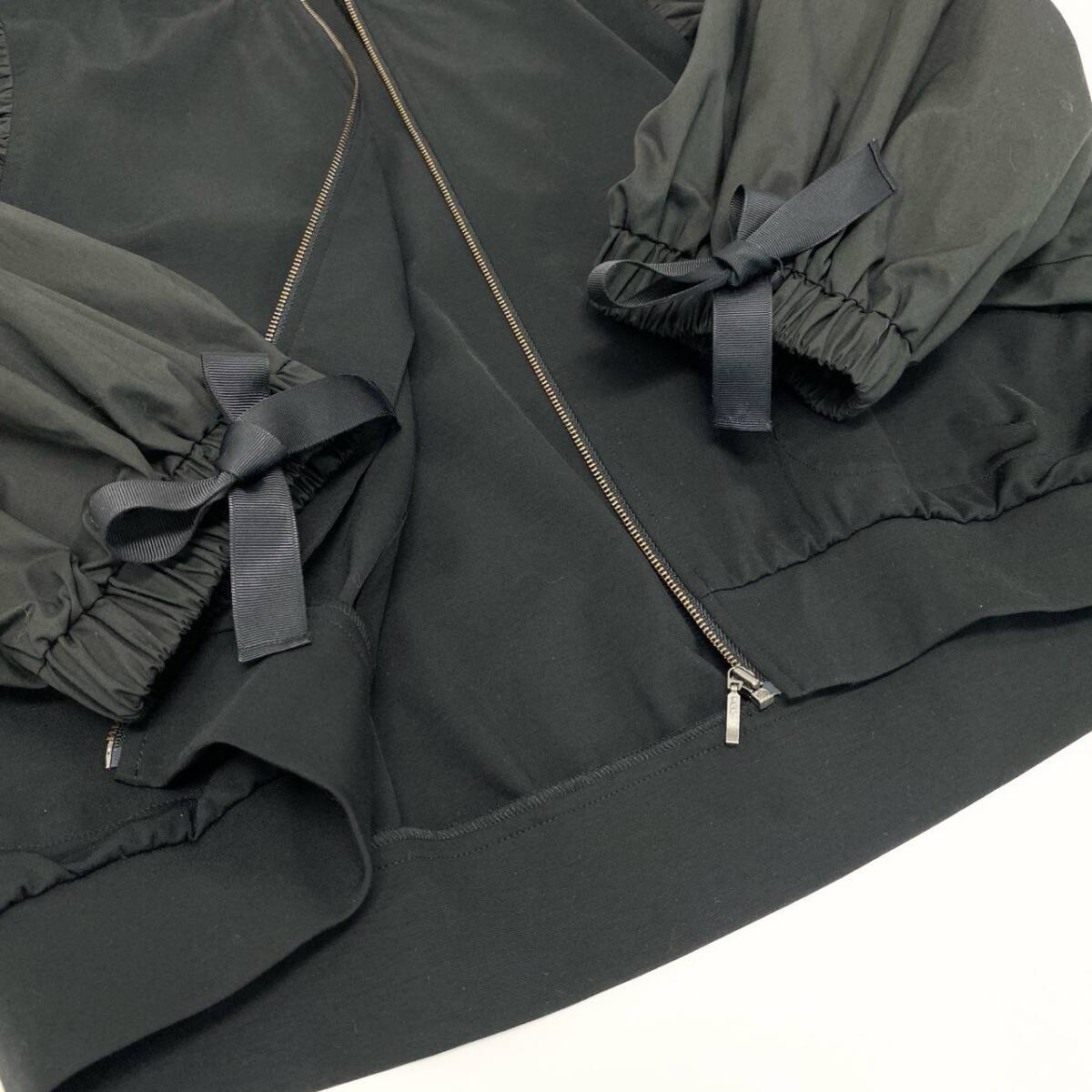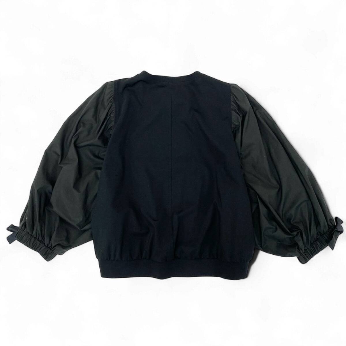 | スタッフ商品コメント | トクコプルミエヴォルらしいボリューム感のあるドルマンスリーブデザインが魅力のノーカラーブルゾンです。カラーは深みのあるブラックで、身頃はマットなコットン風、袖はわずかに光沢のあるナイロン調素材を用いた異素材切替がポイント。袖口にはリボン結びのドローストリングが施され、シルエット調整が可能。フロントは使いやすいフルジップ仕様で、軽アウターとしてデイリーに取り入れやすい一着です。ワイドパンツやロングスカートとも相性が良く、コーデに立体感をプラスします。 |