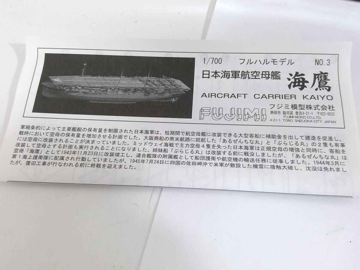 ※佐川急便の場合、離島など別途中継手数料がかかる地域が御座います。 その場合はお振込みを追加でお願いする場合が御座います事、 事前にご了承の程、宜しくお願い致します。 [商品名] 1円スタート FUJIMI フジミ模型 1/700 フルハルモデル 日本海軍航空母艦 海鷹ほか プラモデル 合計4点セット [参考サイズ:海鷹箱サイズ] 約13×30×5cm [仕様] 箱付き(汚れが御座います) [状態] 未使用品ですが、保管汚れが御座います。 倉庫保管の為神経質な方のご入札はご遠慮下さい。 ※未開封品は、中身の確認は致しておりません。 付属品は写真のものが全てです。 記載の無い状態がある場合も御座いますが、写真でご判断下さい。 上記状態をご理解頂ける方のみご入札の程宜しくお願い致します。 [状態ランク] SA