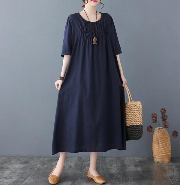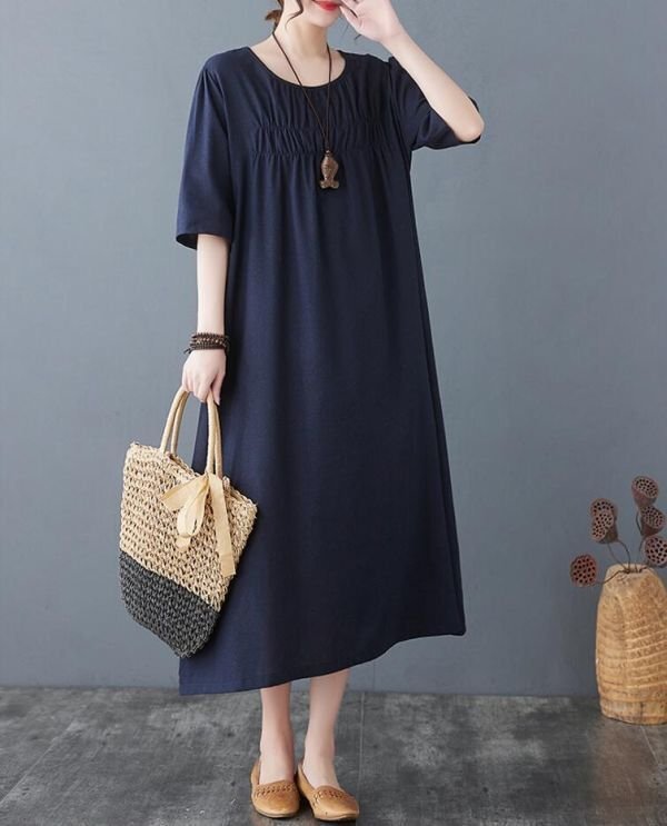 夏新品 カジュアル 綿麻 半袖 マキシワンピース レディース 体型カバー 着痩せ ロングワンピース ★紺 /Lサイズ