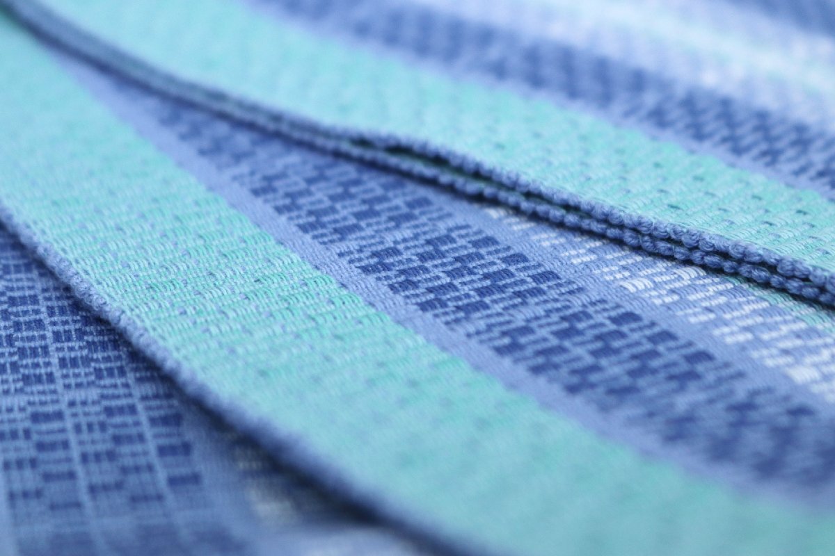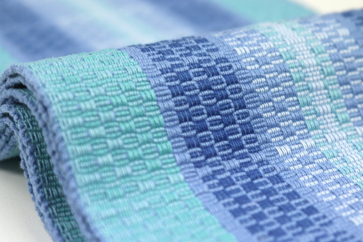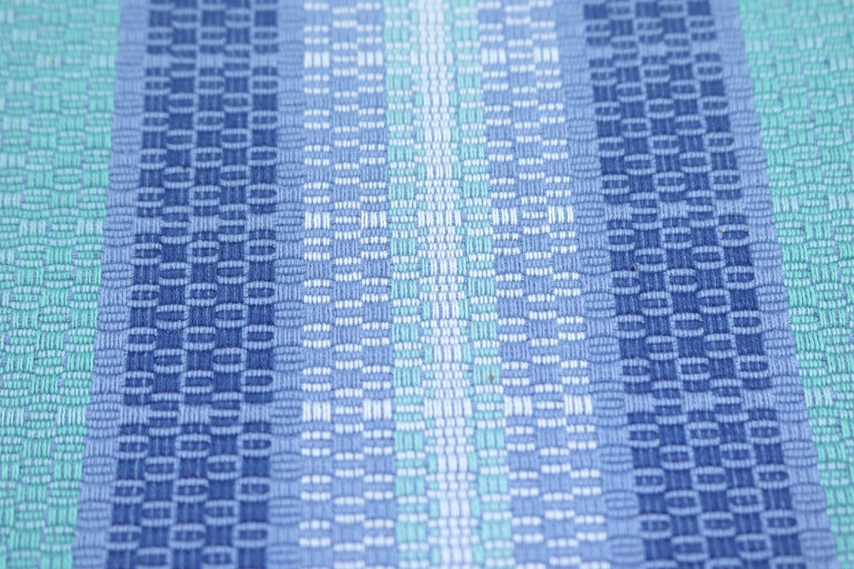 こちらの帯は、未仕立てでございます。お手元に届きましたら、両縁をかがりお使いください。 ややコシのある帯地は、ブルー系のお色目でございます。水色、勿忘草色、青色のお色目で縞文様が織り上げられております。ロートン織のお洒落なお品でございますので、お洒落着によく合います。