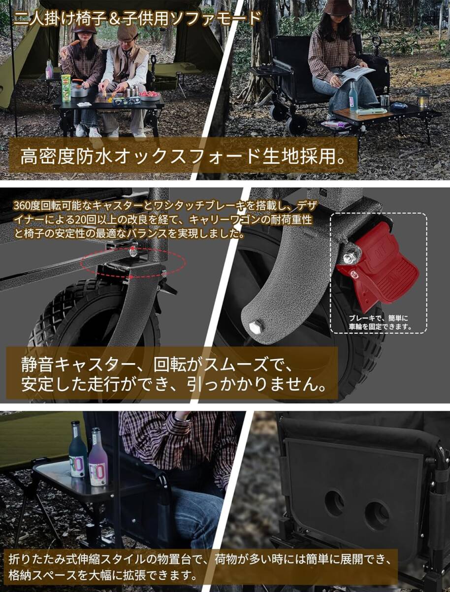 | 【信頼できる工場&業内トップレベル】30年以上の経験でプロ級スポーツ&アウトドア用品の製造と開発に努め、意匠権も登録しました。世界レベル製造工芸あるサプライヤおよびプロバイダで、品質には心配せず、安心にご利用いただけます。【折りたたみチェア/ テーブル/テント/キャリーワゴン/キャンプコット/キャンプマット/焚き火台】◆自主開発の設計◆累計販売台数200万台突破◆ アマゾンランキング第一位獲得!【国際検査基準を導入、日本人の安心な品質管理】全ての製品も国際検査基準による全数検査を行い、品質とサポート体制も完備しております。使用時/約106×56×高さ78.5cm、収納時/約52×20×58cm 。本体重量 : 約12kg。耐荷重:約200kg。 【3WAYキャリーワゴン & キャンプ 椅子 2人掛け &&子供用ソファ】360度回転可能なキャスターとワンタッチブレーキを搭載し、デザイナーによる20回以上の改良を経て、キャリーワゴンの耐荷重性と椅子の安定性の最適なバランスを実現しました。◆ 椅子やソファとして使用する際は、ブレーキボタンを軽く押してフレームを安定させ、マジックテープを外して布を下ろすことで、座席モードに切り替えることができます。パールコットン製のクッションが付いており、背もたれのポケットに収納可能です。これにより、背中がよりリラックスでき、クッションとしても使えるため、座り心地がさらに快適になります。◆身長1メートル以内の子供は、アウトドアベッドやソファとしても使用できます。 【多機能】:【フック付き】このキャンピングカーにはフックがあり、ロープで荷物をしっかり固定できます。平坦でない道や坂道でも荷物が落ちる心配はなく、より安定した状態を保つことができます。◆【ワンタッチブレーキ】軽く踏むだけで固定できます。坂道などでもお気軽にお使いいただけます。◆【追加超大収納バッグ】雑誌やタオル、スリッパ、ゴミ袋などの用品を収納できます。◆【折りたたみ式伸縮スタイルの物置台】物が多いときに簡単に広げて、水杯やお菓子などの小物を置くことができます。使わない時は折りたたんで収納でき、場所を取らず、とても便利です。 【2WAYクッション—腰用クッション&座布団】このシートには、背もたれのポケットに収納できるパールコットン製のクッションが付いており、背中の圧力を効果的に和らげ、リラックスさせます。また、座布団としても使用でき、座り心地がさらに柔らかく、快適になります。この柔らかいクッションを使用すれば、ベビーカーとして使う際に、赤ちゃんが不快で泣き止まない心配がなくなり、安心して両手を解放できます。ショッピングモールでの買い物や日常的な短距離移動、家での育児など、さまざまなシーンで活躍します。日よけテント付きのデザインにより、雨天や直射日光の日でもしっかりと保護されます。 【高耐&厳選素材】耐摩耗性、引裂強度に優れた高密度900Dオックスフォード布で作られており、硬く鋭利な部品を持つ大きな物品も安全に収納できます。突発的な悪天候でも損傷や汚れに耐えることができ、布面は取り外して洗うことができます。頑丈な四層のスチールフレームを採用しており、より高い安定性を提供し、最大200kgの荷重に耐えることができます。 荷物の運搬はもちろん、2人の大人が一緒に座っても楽に対応できます。 【心配りのデザインで、簡単に移動】O型ハンドルは自然な形状で、指への負担を軽減し、どの方向からでも片手で簡単に握ることができ、力を加えることが簡単で、効率よく伝達できます。これにより、力の調整や方向転換が容易になり、快適にカートを移動できます。◆ 【組み立て簡単、収納も簡単】 組み立て不要で、数秒で簡単に展開・収納できます。女性でも簡単に折りたたむことがで、同じ容量の他の製品と比べて収納サイズが非常に小さいため、どこに置いてもスペースを取らず、後部トランクに収納するのにも便利です。キャンプや花見、運動会、イベント出店など、様々なシーンで大活躍です。 注意:この製品は実用新型特許を申請しており、設計の目的は、キャリーワゴンとしてもソファチェアとしても使用できるよう、長期間の耐久性と優れた耐荷重性を確保することです。そのため、主フレームに多くのコストを投入し、壁厚を増しました。壁厚の増加により、車両全体の重さは12キロに達しました。DesertFoxキャリーワゴンの目標は、新しくて堅牢で耐久性のある携帯旅行車を作ることです。これは、フレームの壁厚を拡張し、強化することに表れています。この製品は、軽量化を追求して耐荷重を保証できないものではなく、収納スペースを節約するために複数のパイプを組み合わせたフレームでもありません。そのような構造は耐荷重能力を犠牲にすることになります。L130 |