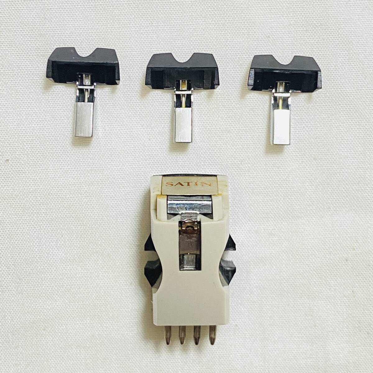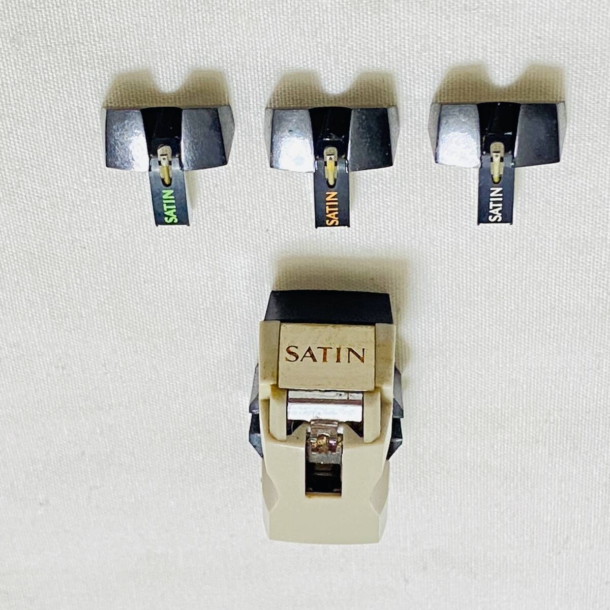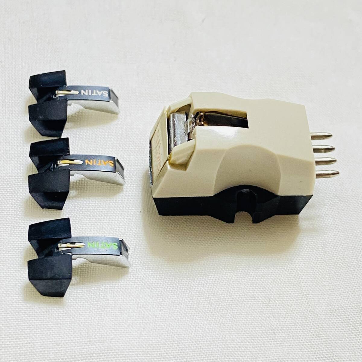 This listing includes the M15 air-core, direct-coupled, moving-coil cartridge, which was Satin's high-end cartridge model, and a set of three genuine replacement styluses.