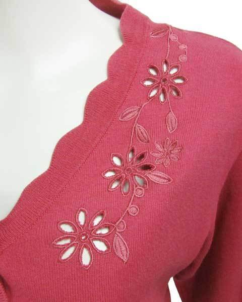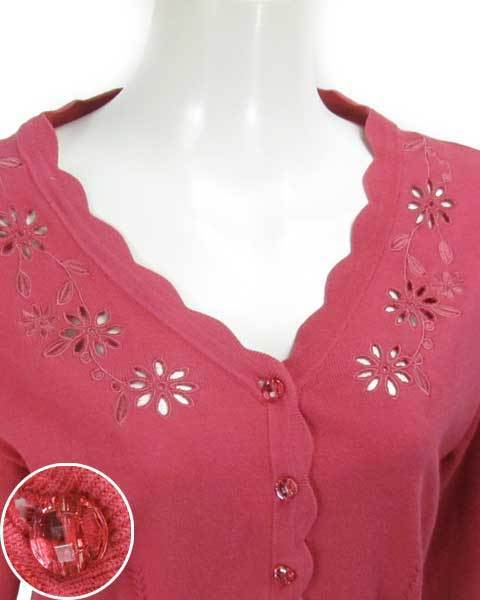 | 華やかなピンクのフェミニンなカーディガン。胸元のお花刺繍やパンチングが女性らしい雰囲気。カーディガンを差し色にオシャレが楽しめます。3シーズンお使い頂けて重宝します。 |