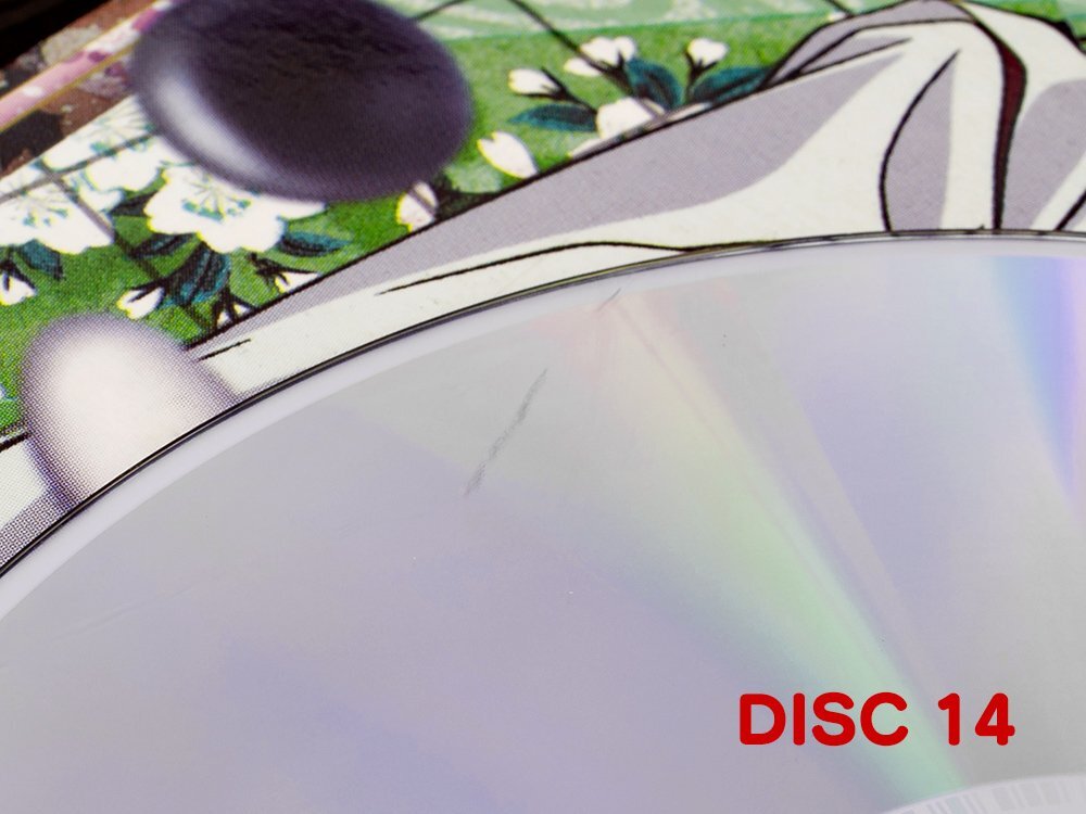 ほとんどのディスクの盤面には目に付く大きなキズや汚れ、破損などありませんでしたが、一部のディスクには盤面に若干のムラやエッジ部辺りに少しひっかけた様なキズがあり、その他のディスクにもクロスで拭えば付く程度の薄キズやスレなど若干の使用感があります。 |