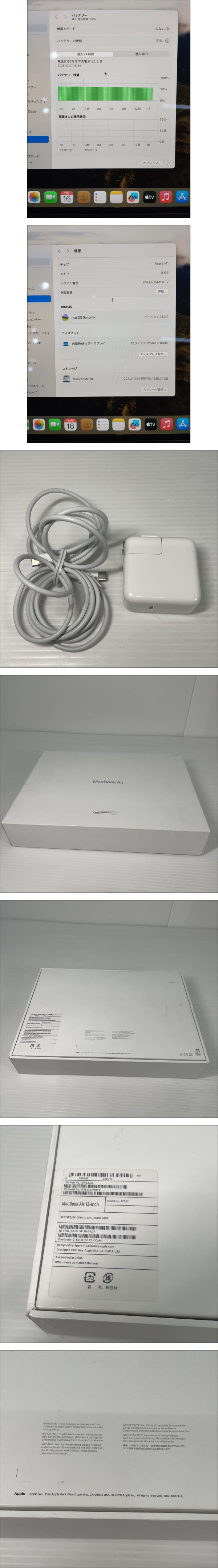 ※他 出品商品との「同梱発送不可」となります。 ※おまとめ依頼があった場合でも「個別取引」となりますので予めご了承くださいませ。 ※弊社指定の配送方法となりますので、配送方法変更不可となります。 (沖縄県は(60サイズ以上の商品)ゆうパックのみでの配送) ※領収書発行可能 (領収書は商品同梱となりますのでメール送信・別住所への郵送はできません) 領収書が必要な場合は、支払完了前までに取引ナビにてお知らせください。 ※落札より2日以上ご連絡が無い場合は「落札者都合でのキャンセル」となります。 ------------------------------------------------------------------------------------------- 【機種】MacBook Air 【容量】メモリ8GB/ストレージ256GB 【型式】FGN63J/A 【動作】通電確認済 ※充電可能/電源入ります(出品時) ※傷・汚れ有。長期保管の中古商品、現状でのお渡しとなりますので、画像にてご確認の上ご入札お願いいたします。美品・完品をお求めの方は入札をお控えくださいませ。 【バージョン】14.2.1 ※付属品につきまして、画像に写っているものが全てとなります。付属品の動作確認はいたしておりません。 ※アクティベーションロックは解除済みの商品となります。 ※商品の詳細につきまして、専門業者ではございませんのでお答えできかねる場合がございます。 ※状態に関して、経年劣化による、小傷や汚れ等はご了承くださいませ。 見落としがある可能性も御座いますので、詳細は画像にてご確認頂き、画像にてご判断頂ける方のみ御入札をお願い致します。 ※電化製品・精密機器等の保証はございません。 | |||